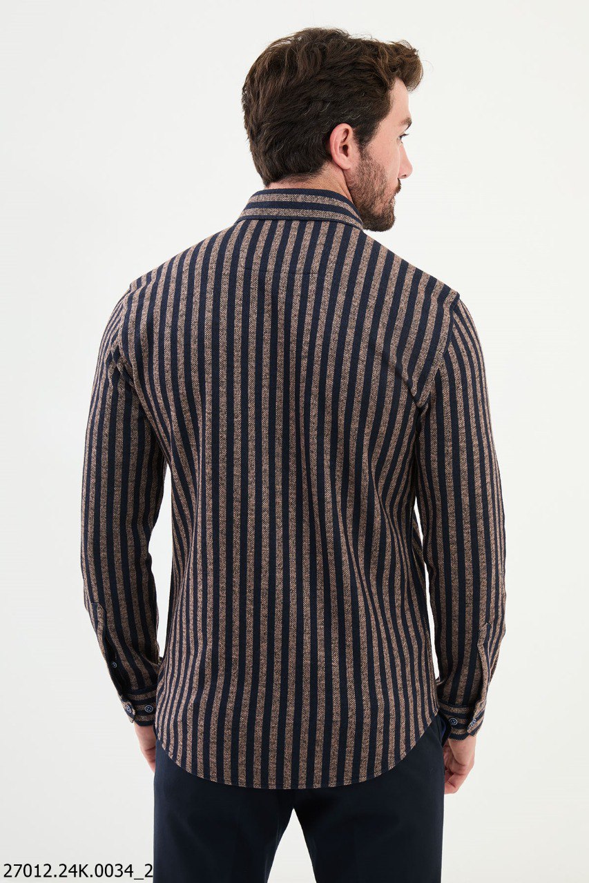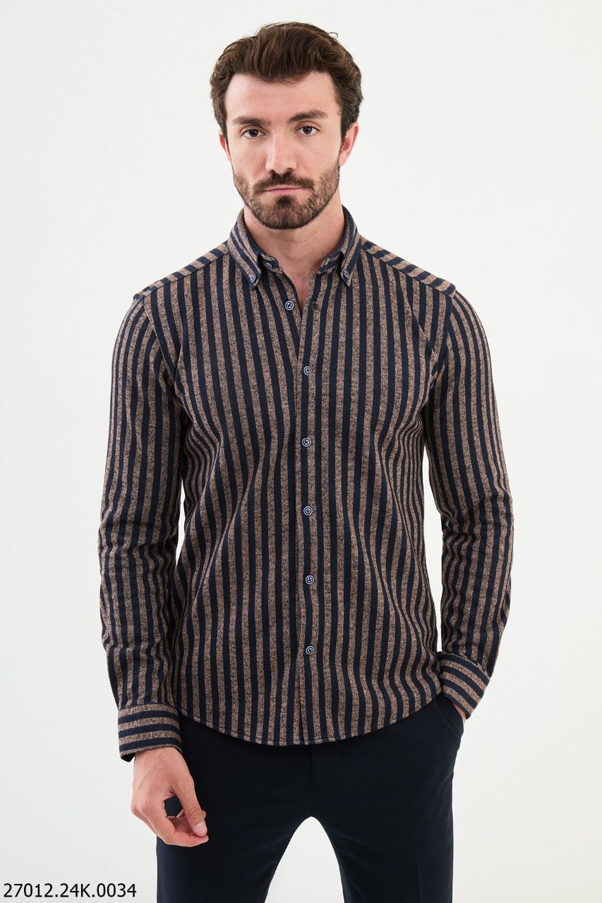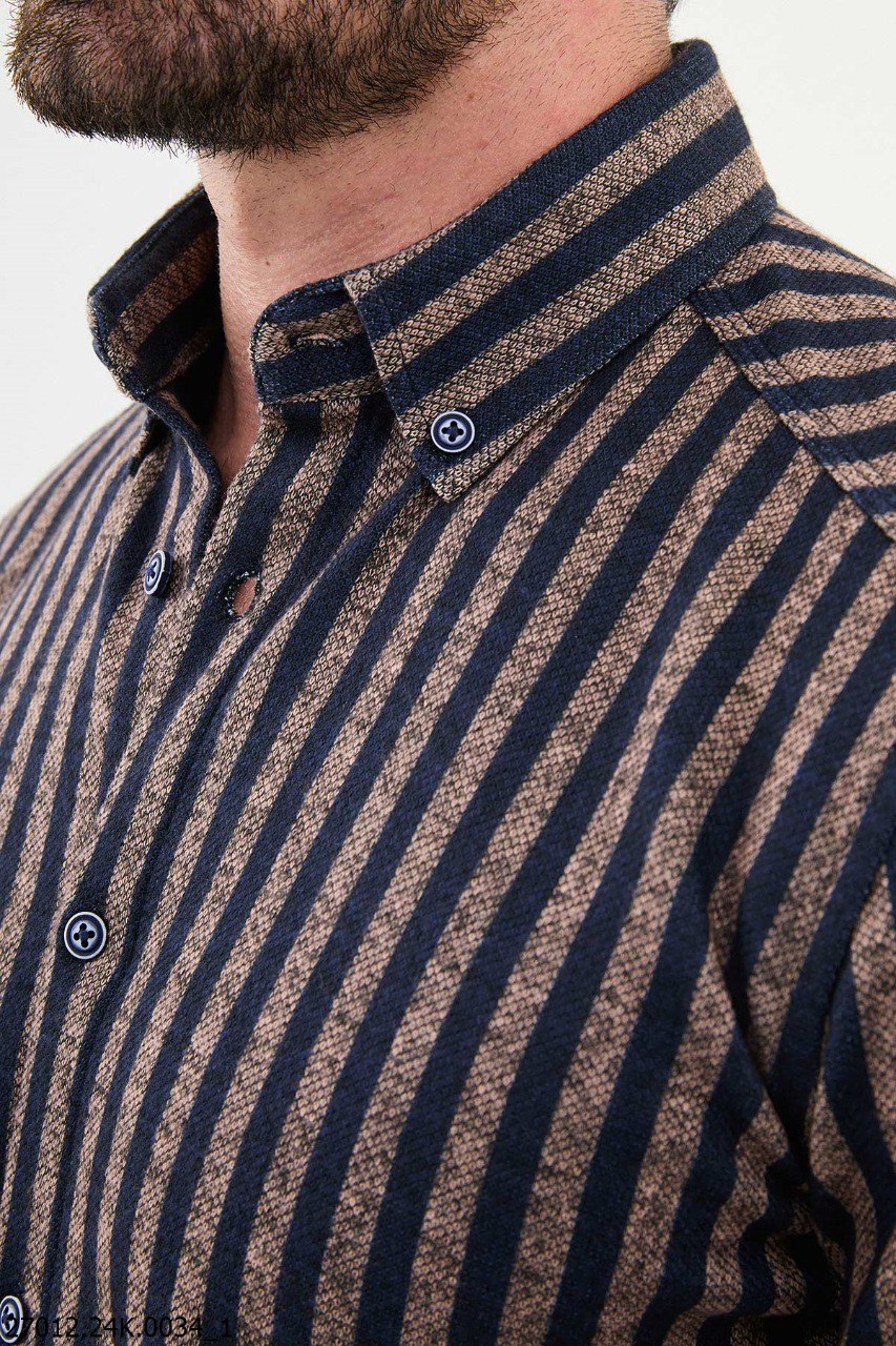 Elevate your style with this beige and navy blue striped shirt crafted for men who value both comfort and elegance. Made from a premium blend of 55% cotton and 45% polyester, this shirt offers a soft, breathable fit that's ideal for Fall-Winter wear. The vertical stripe pattern adds a touch of sophistication, making it perfect for both casual outings and semi-formal occasions. Button detailing and a crisp collar complete the refined look. Pair it effortlessly with chinos or jeans for a polished ensemble.