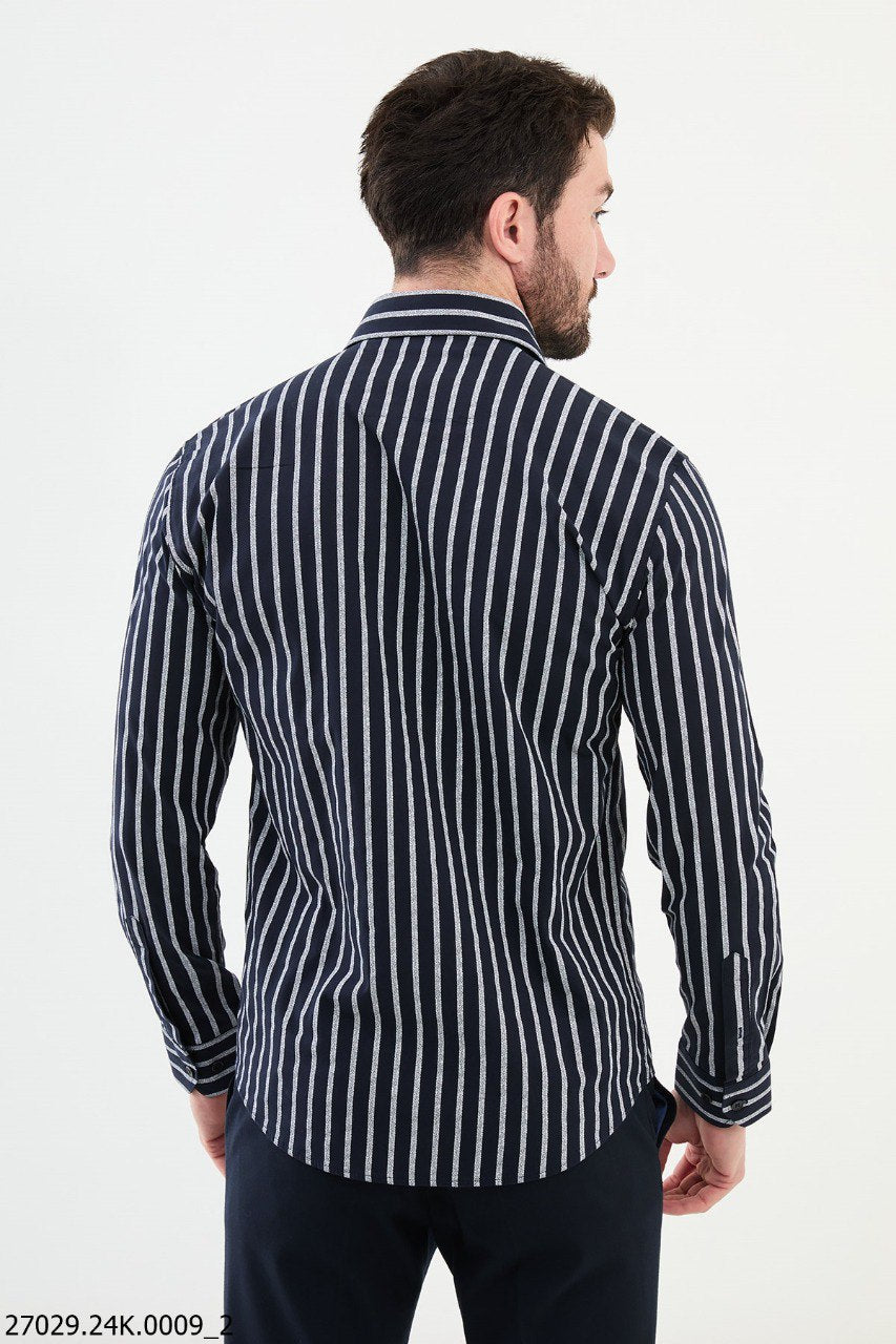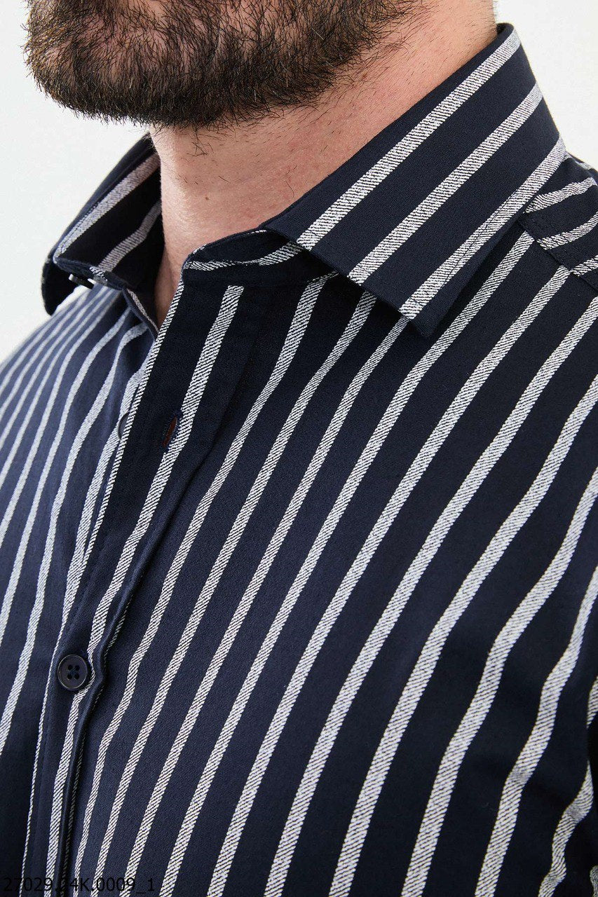 Elevate your wardrobe with this Black and White Striped Casual Shirt, expertly crafted for the Fall-Winter season. Featuring a bold vertical stripe pattern that exudes sophistication, this shirt is made from a premium blend of 55% cotton and 45% polyester, ensuring comfort, durability, and a soft touch. Its tailored fit and versatile design make it perfect for both casual outings and semi-formal occasions. Available in sizes S to XXL, this shirt is the ideal choice for a sharp and polished look.