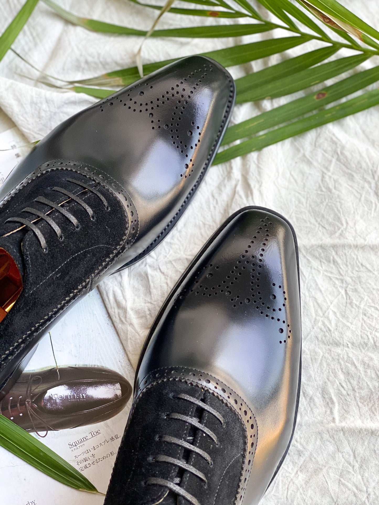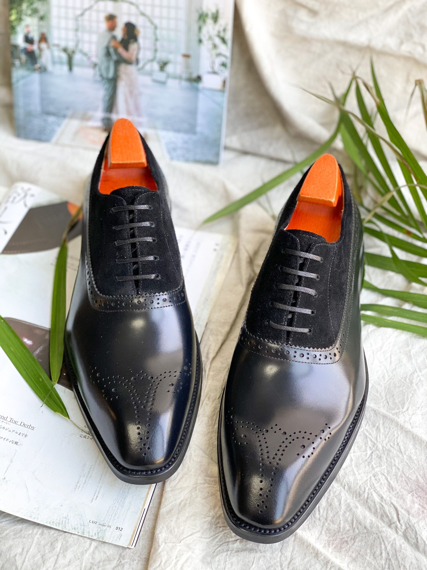 Eleve su estilo con estos clásicos zapatos oxford negros con intrincados detalles brogue y un toque de gamuza de lujo. Elaborados con cuero de primera calidad, estos zapatos ofrecen un aspecto sofisticado perfecto para eventos formales, reuniones de negocios o cualquier ocasión en la que desee hacer una declaración.