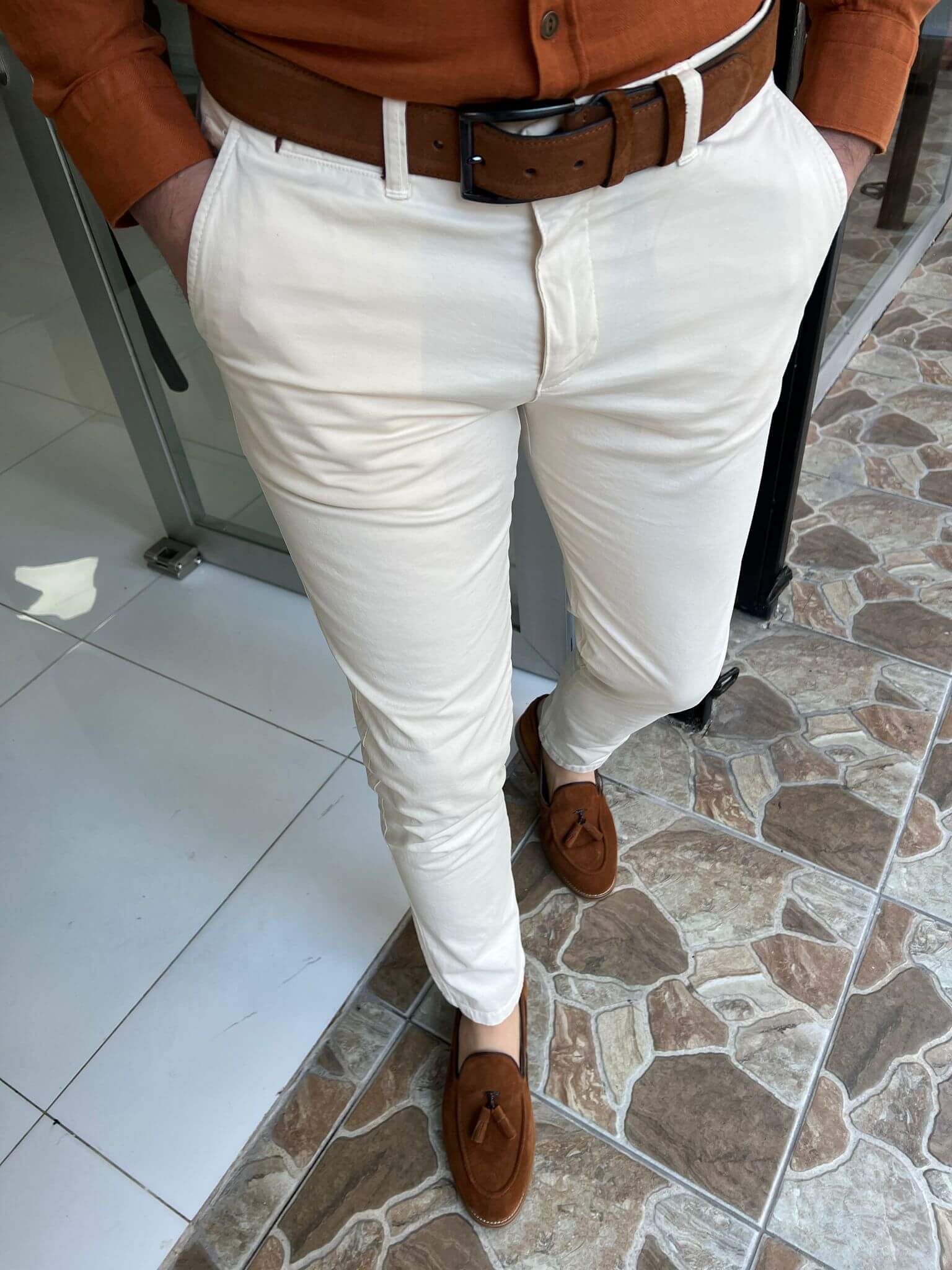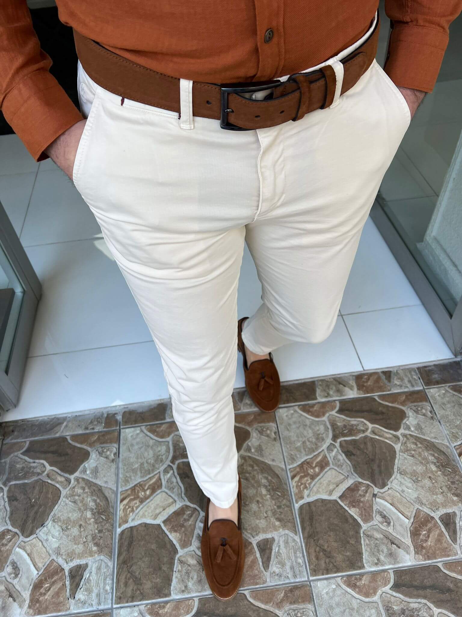 El color del pantalón es CREMA y su tejido incluye 97% algodón, 3% lycra.