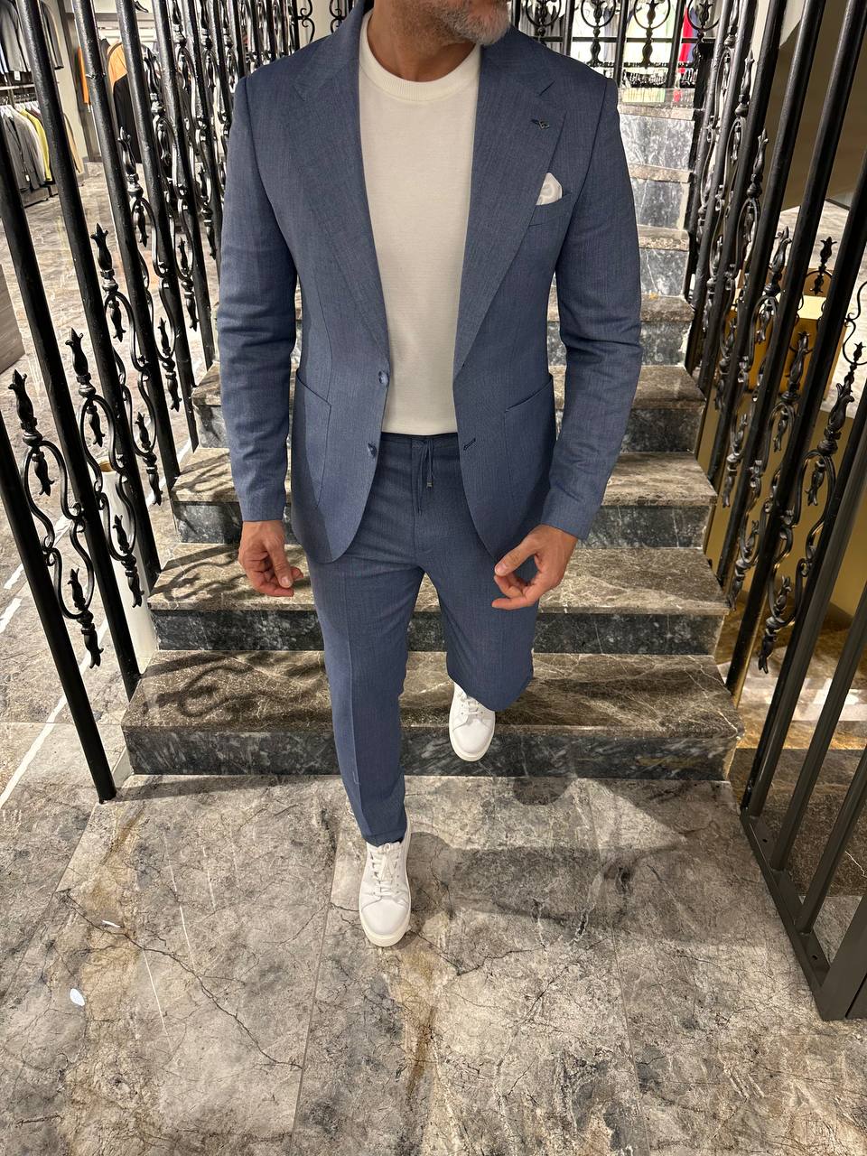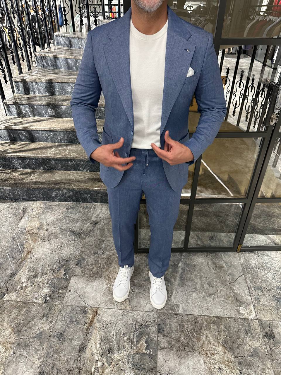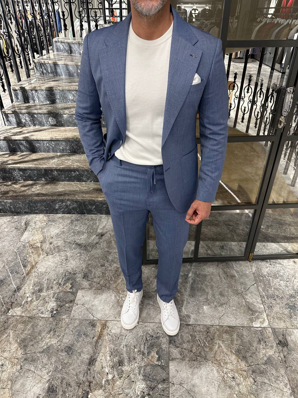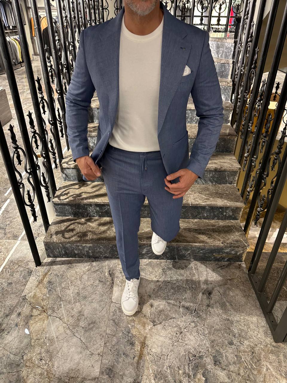 HolloMen Navy Blue Linen Suit - Summer Sophistication