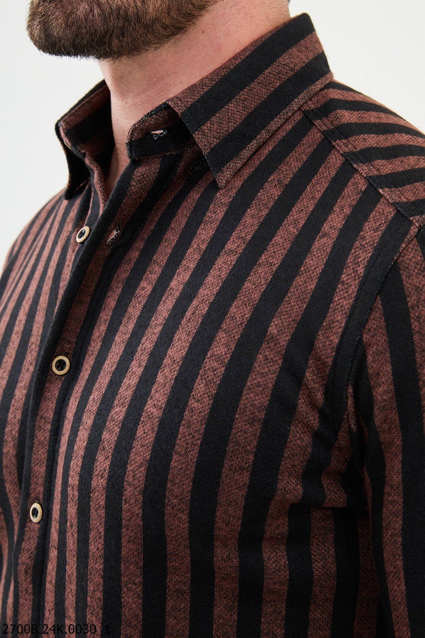 Elevate your wardrobe with this sophisticated brown and black striped shirt, crafted from a premium blend of 55% cotton and 45% polyester. Designed for both comfort and style, its breathable fabric makes it ideal for year-round wear, while the striking stripe pattern ensures a bold, polished look. Featuring a button-up front and a tailored fit, this shirt seamlessly transitions from office meetings to evening outings. A versatile addition for any modern man's collection.