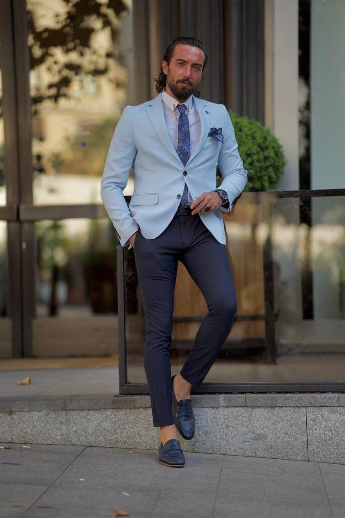 Con una chaqueta blazer azul con cuello mono,