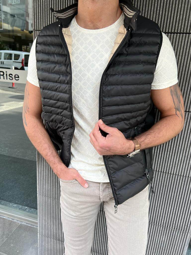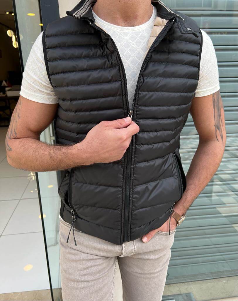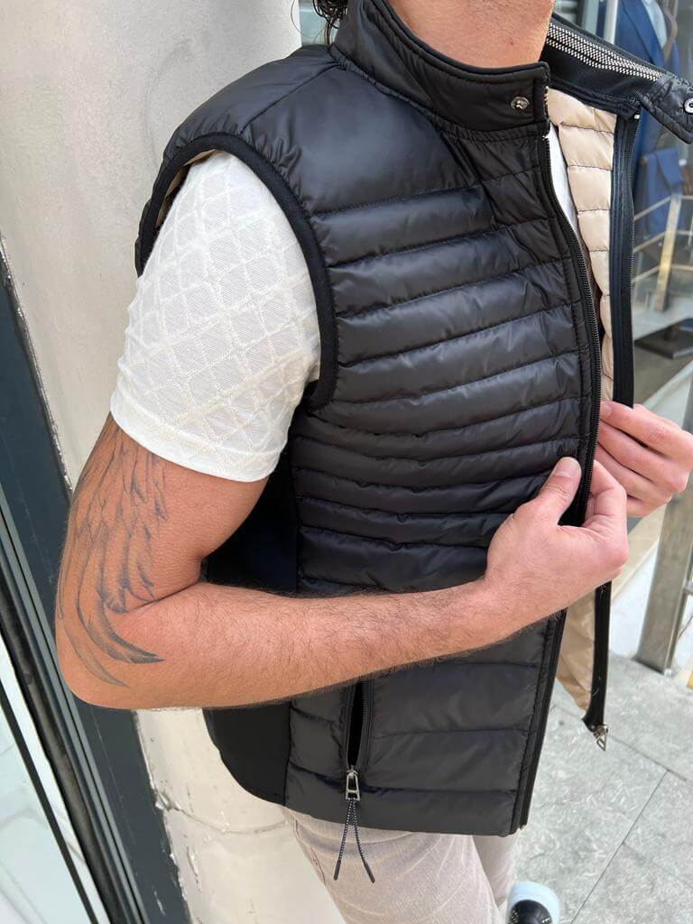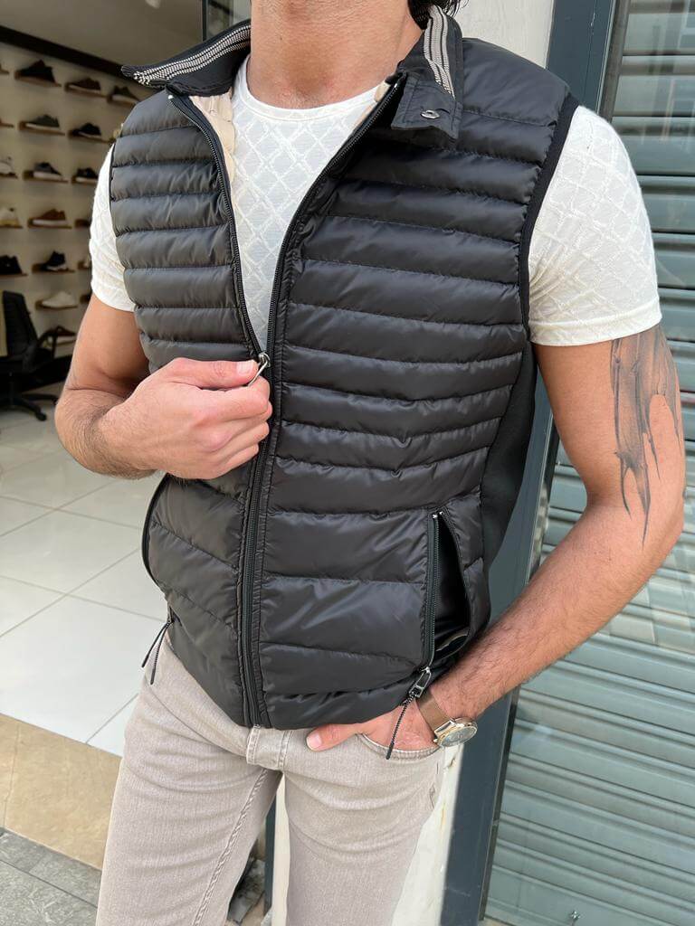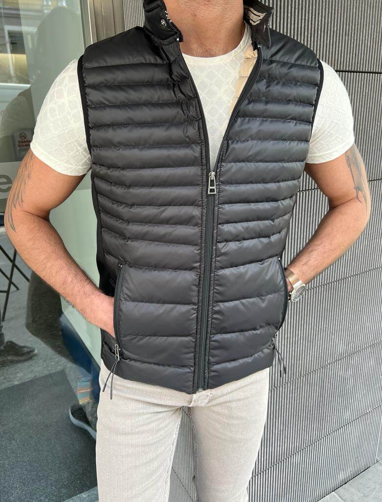 Este abrigo de chaleco acolchado es de color negro, con detalles de cremallera.