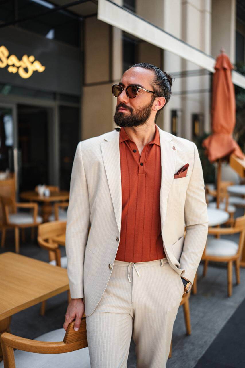 La sofisticación no debería ser un problema. Traje Riviera En beige, es tu compañero ideal para el verano, ideal para bodas en la playa, almuerzos de lujo o copas al atardecer junto a la costa. Con un suave tejido elástico y una mezcla de algodón transpirable, este traje combina comodidad y un corte impecable en una silueta ligera. Un traje de verano moderno para hombre, ideal para climas cálidos, para una impresión duradera.