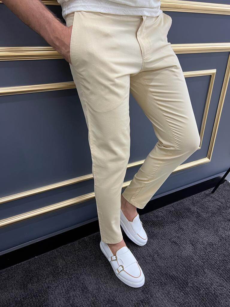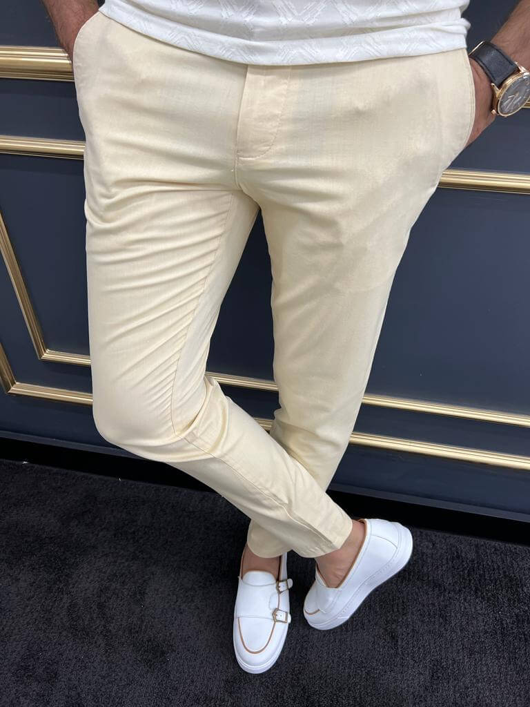 Pantalón slim fit de tejido amarillo de alta calidad con bolsillos laterales & detalle a cuadros.