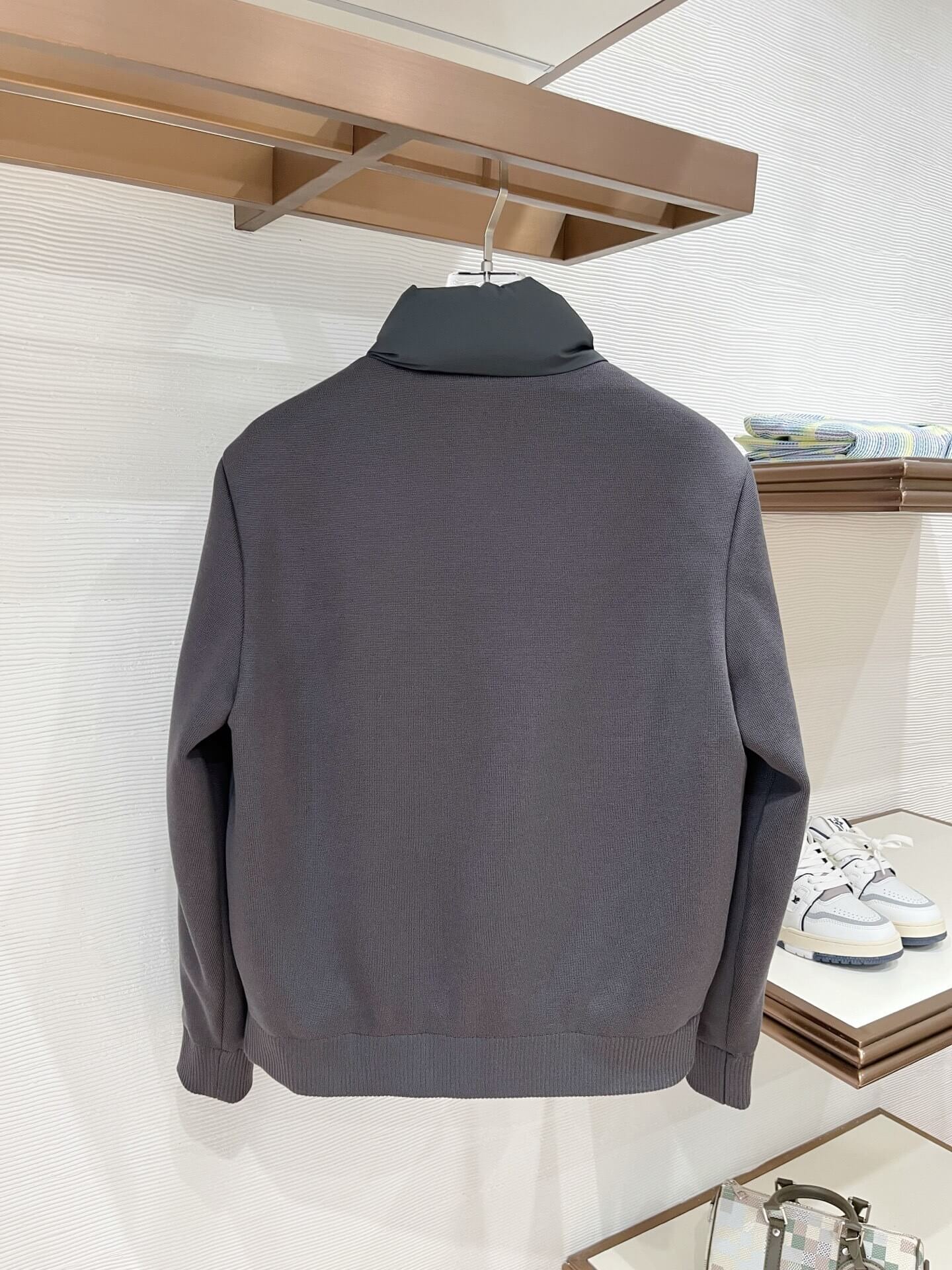 Subtle branding at the chest, ribbed cuffs and hem, and polished hardware work together to enhance the jacket’s premium, quiet-luxury appeal.