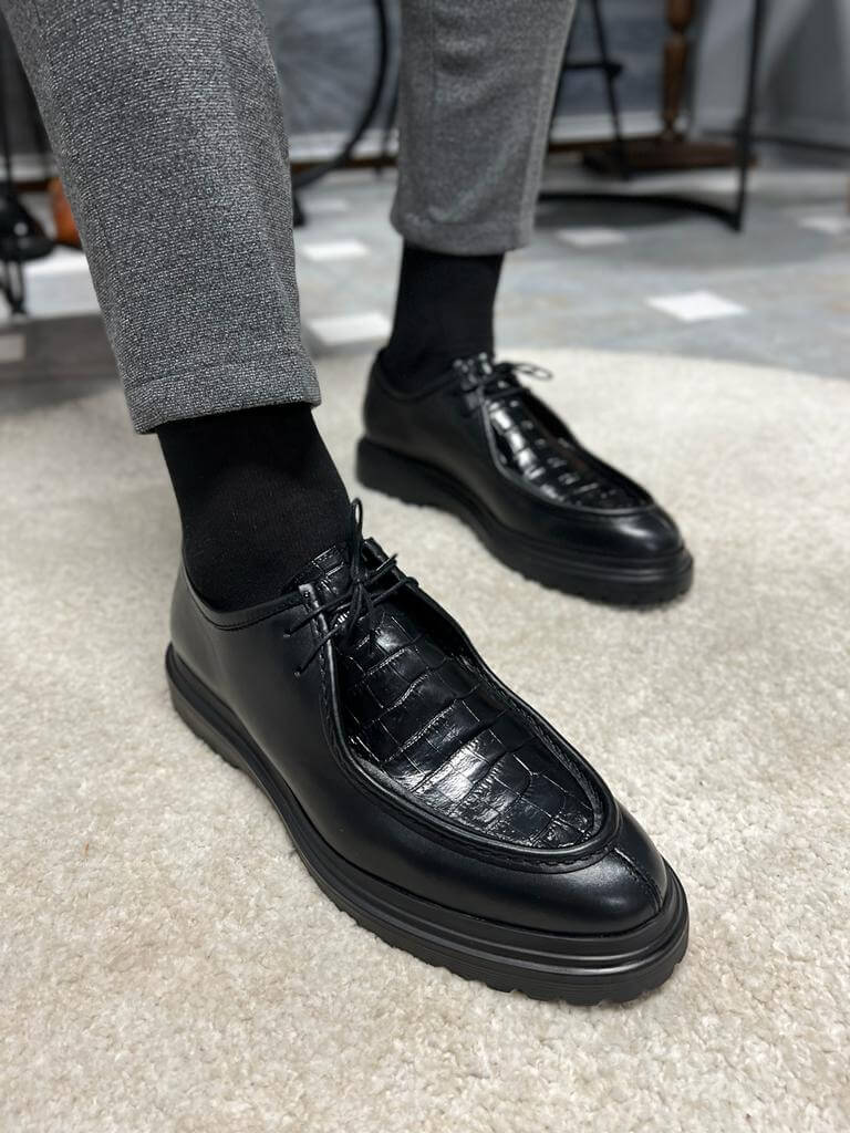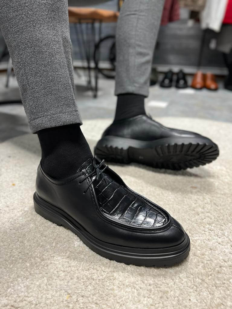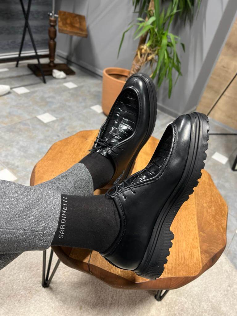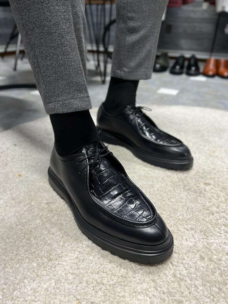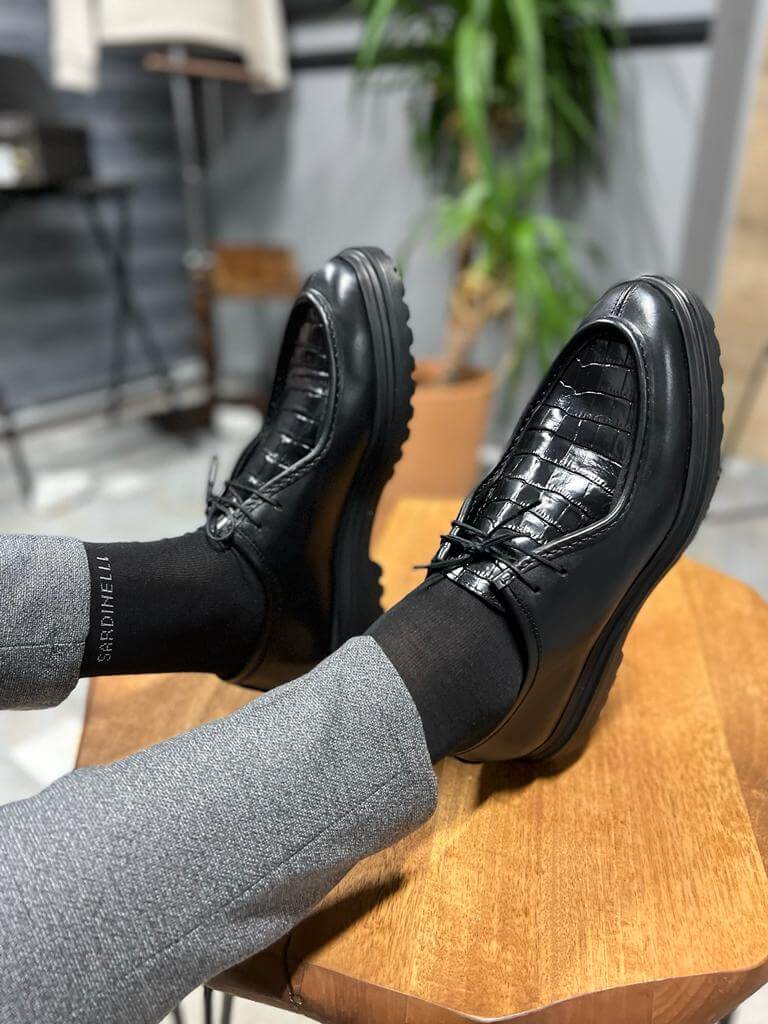 Saison automne-hiver 21/22, avec chaussure à lacets noire à motifs.