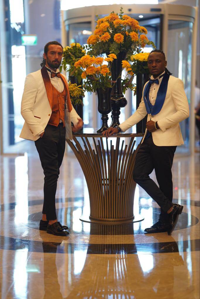 Votre colis comprendra une veste, un gilet, un pantalon, une chemise et un nœud papillon.