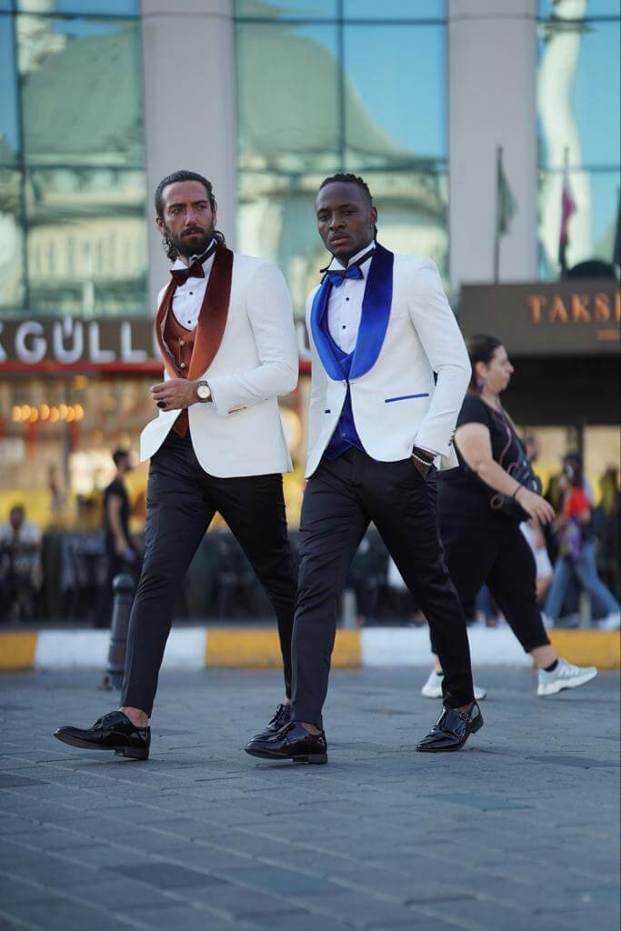 Nous vous présentons un smoking blanc coupe slim à col en velours.