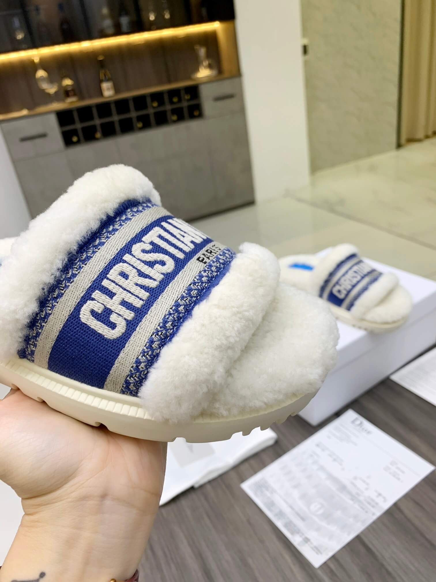Sandales compensées Christian Dior Dway en fourrure lainée bleue et blanche avec logo