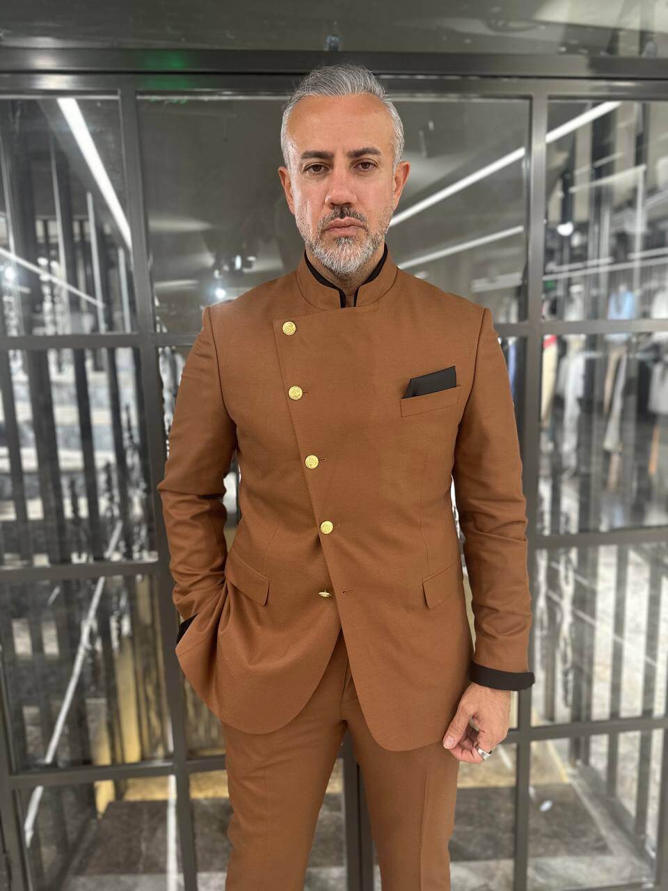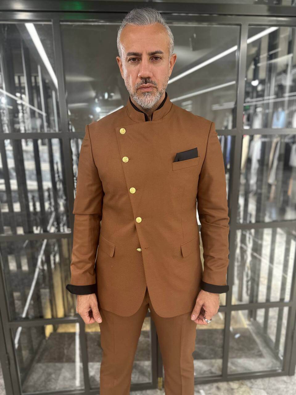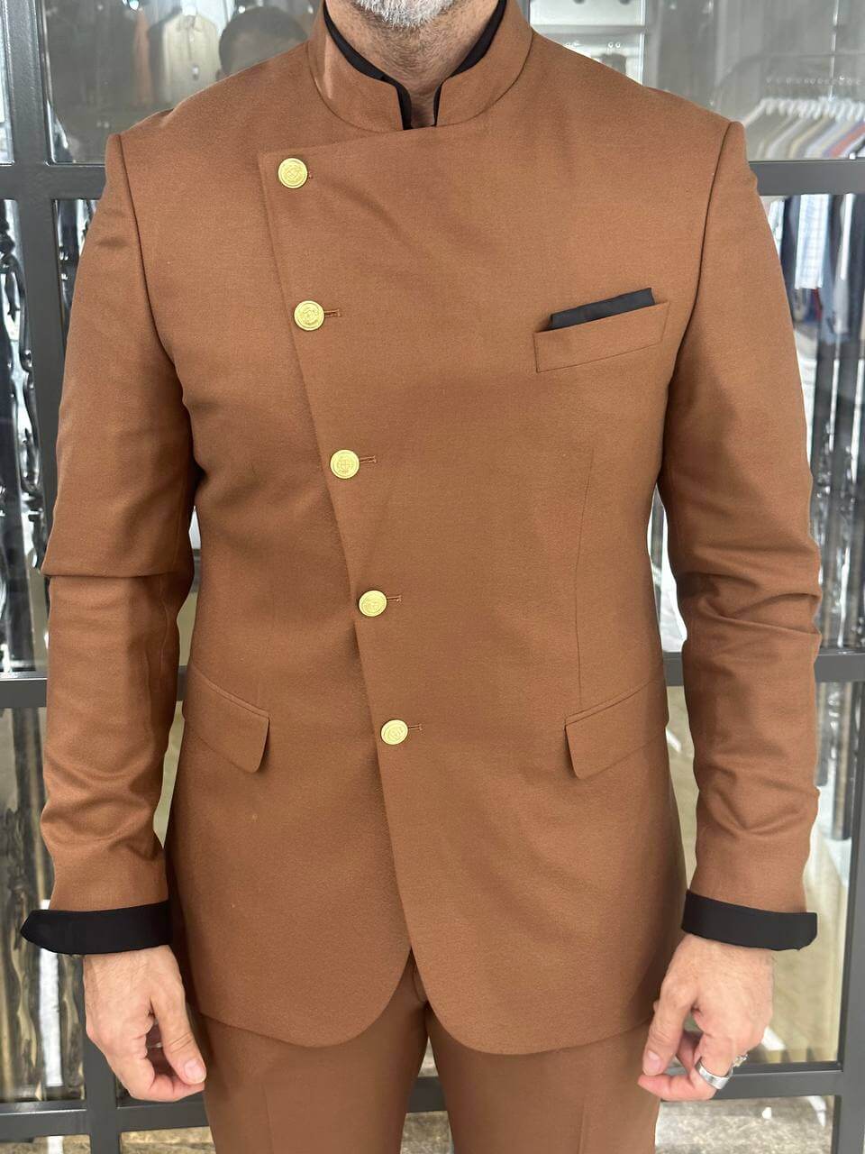 This distinctive suit features a sleek mandarin collar and eye-catching gold buttons designed to make a bold statement. Ideal for weddings and formal events, this suit is perfect for the modern gentleman seeking elegance and uniqueness.