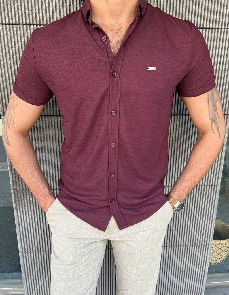 Nous proposons une chemise bordeaux à manches courtes et col bébé de haute qualité.