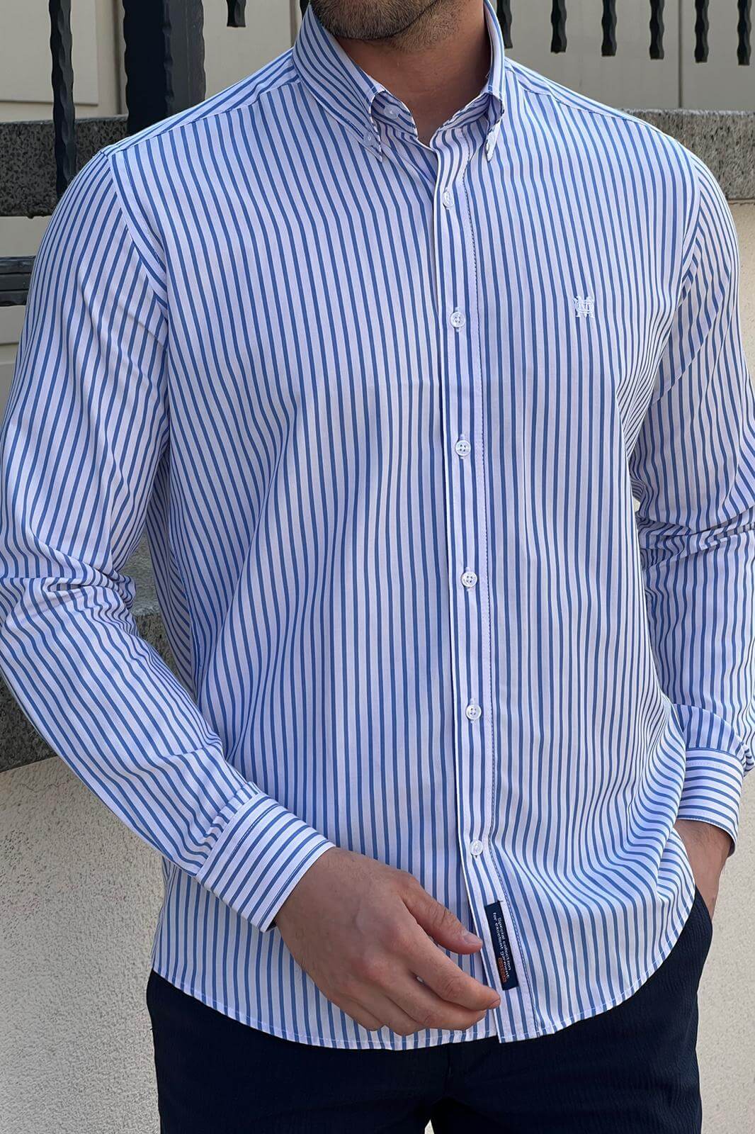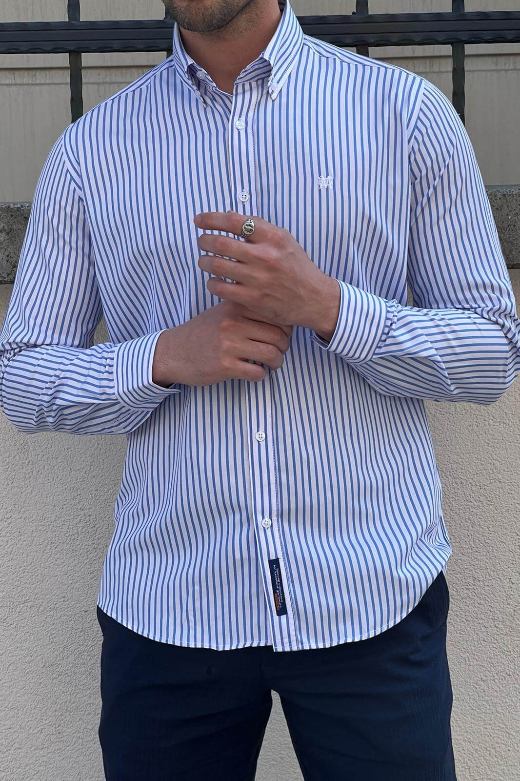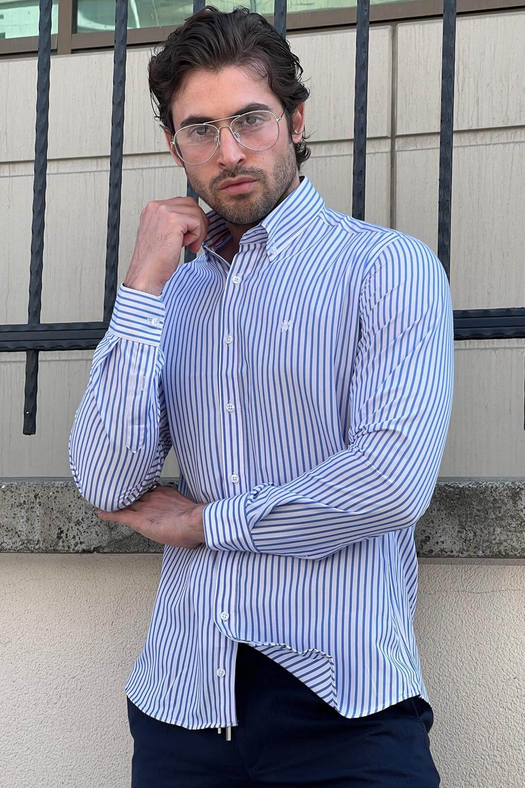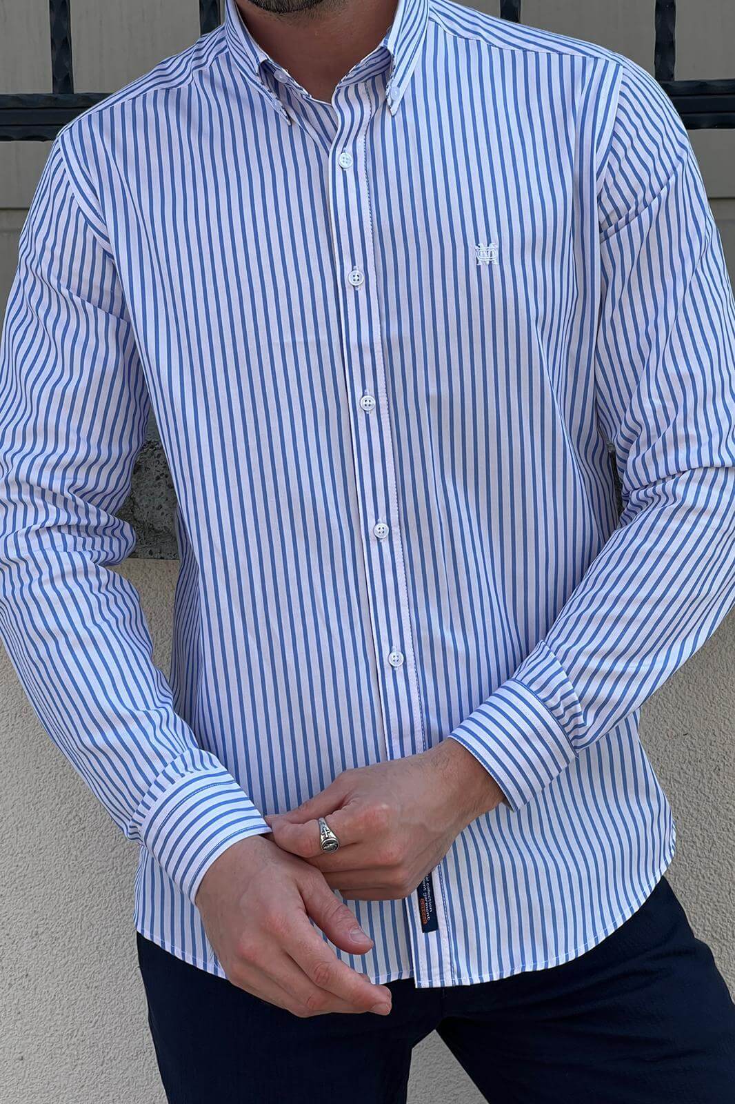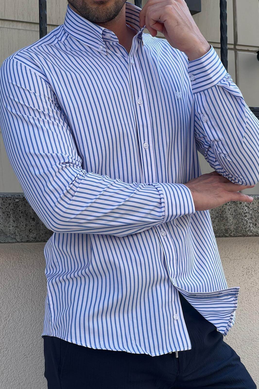 We're featuring a Slim Fit Stripped white and Blue Cotton Shirt, with a button collar.
