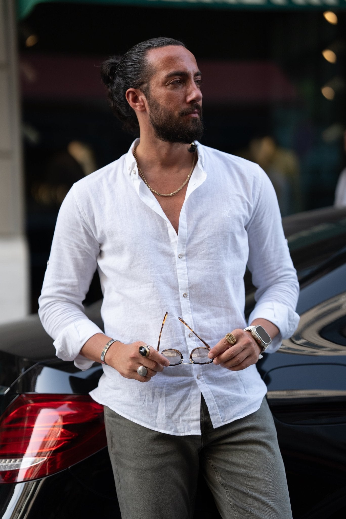 We're Featuring a Special Design Slim Fit White Linen Shirt.