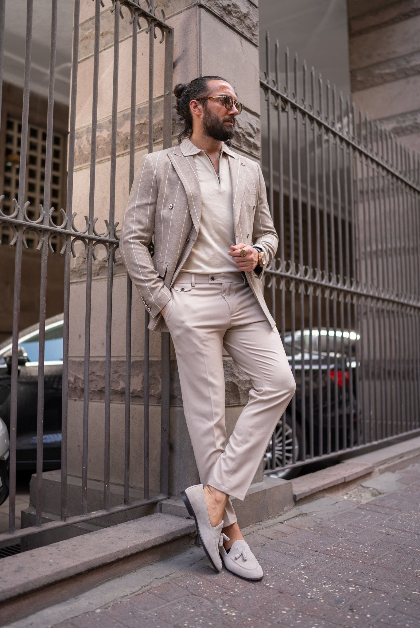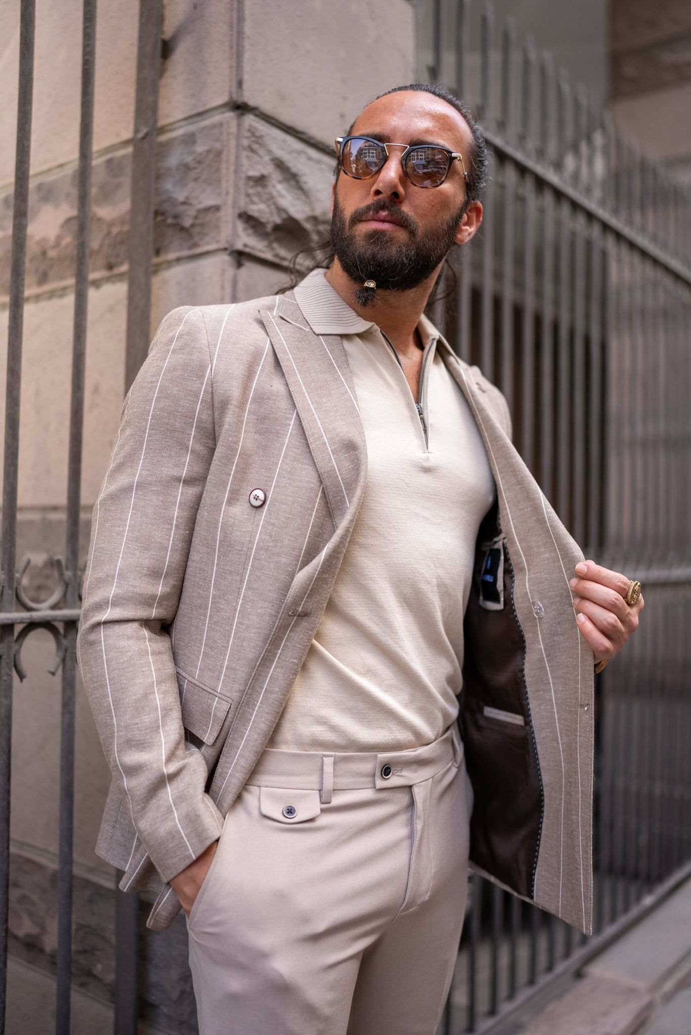 We're Featuring a Special Design, Slım Fıt Beige Mono Collar Stripe Patterned Double Breasted Jacket.