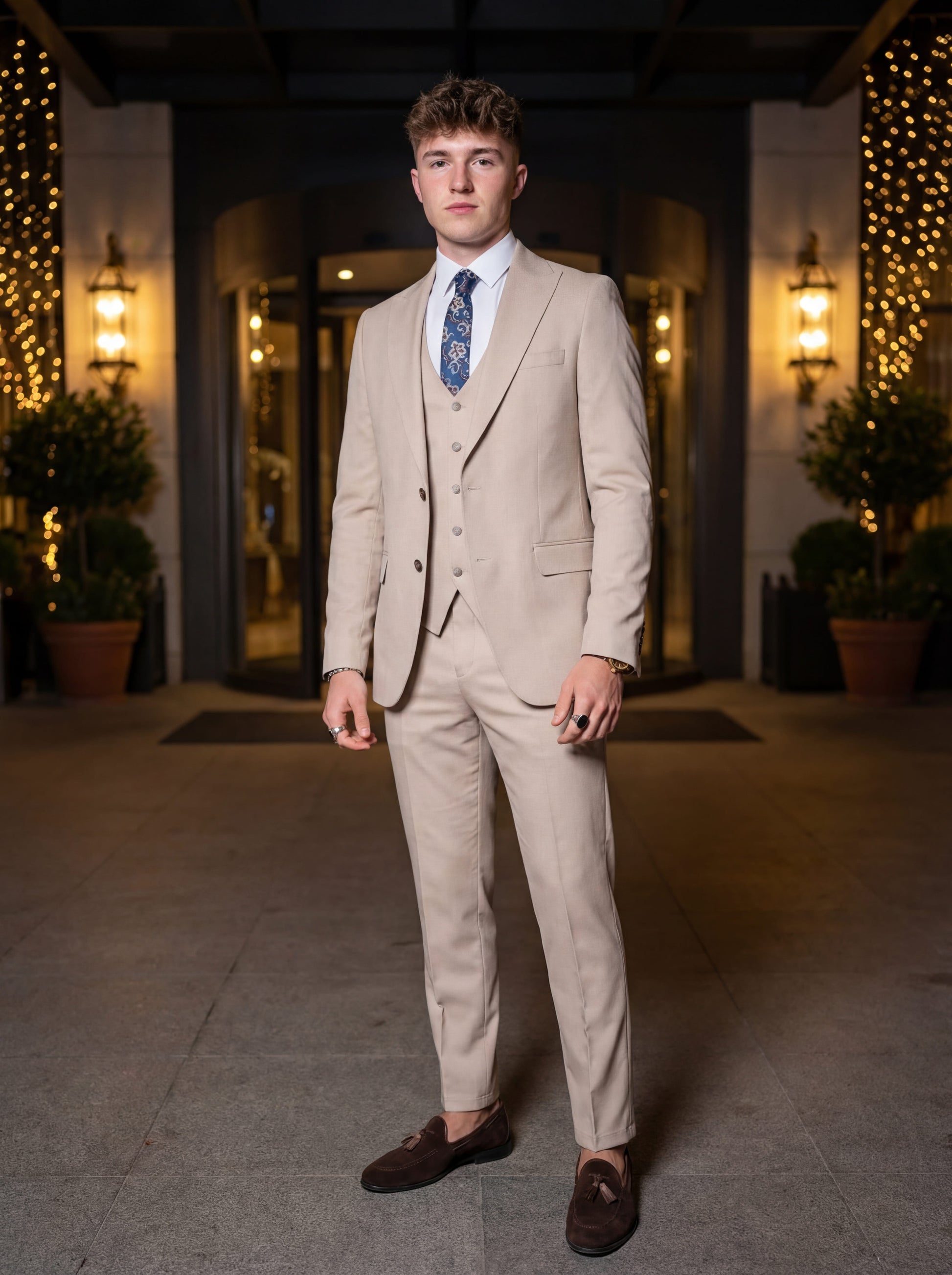 Tie: A patterned blue or earth-toned tie (as seen in our campaign) adds a necessary focal point to the neutral beige.