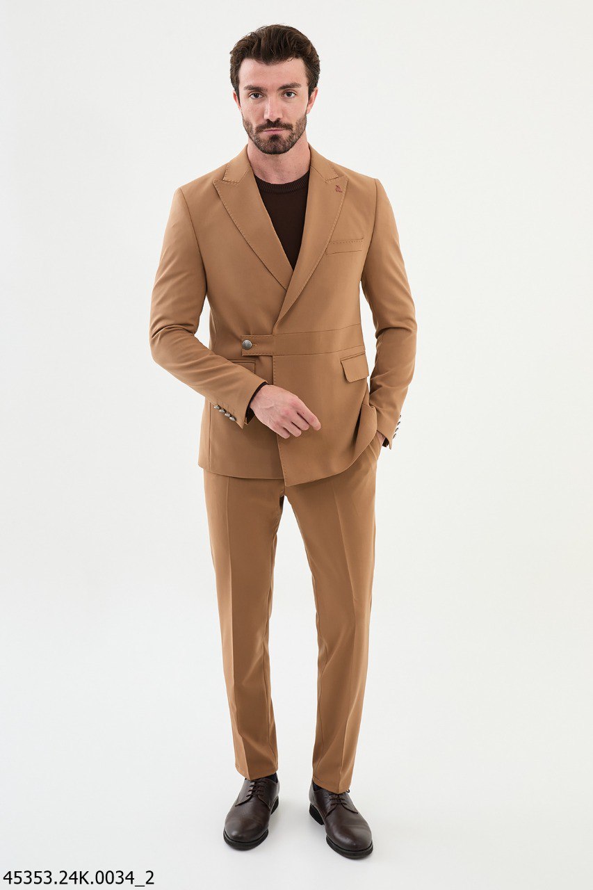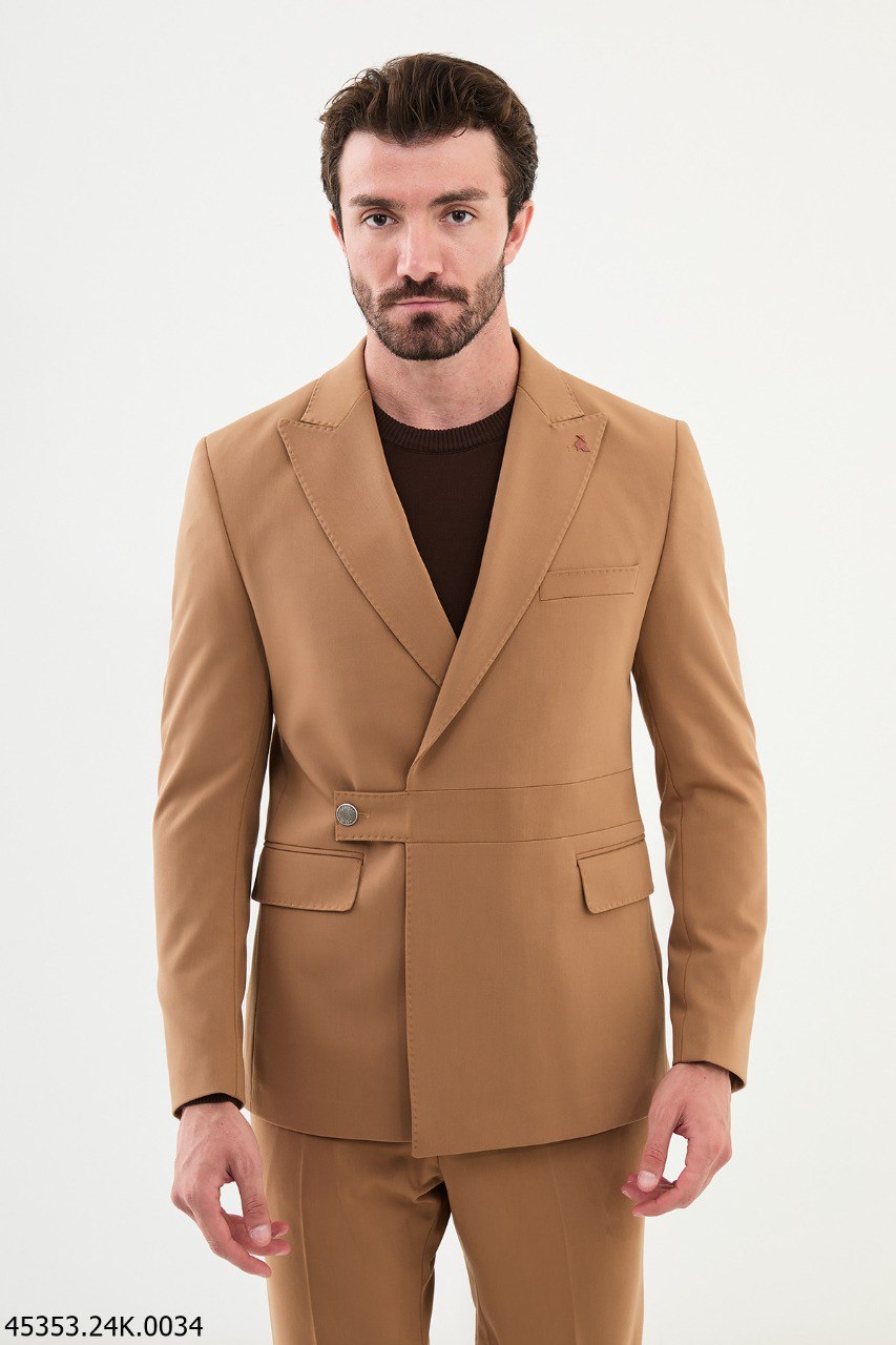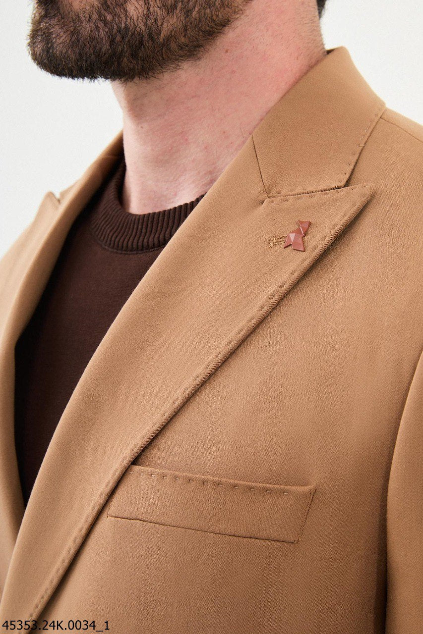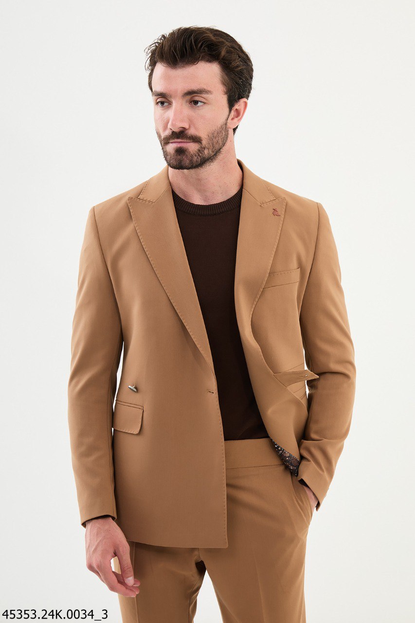 Crafted for the refined man, the HolloMen Camel Beige Single-Breasted Suit is a stylish upgrade to your wardrobe. Featuring a slim-fit cut and single-button closure, this suit is tailored for versatility, blending sophistication with contemporary elegance. The camel beige adds warmth and flair, making it a standout choice for formal and casual settings. Designed with functional flap pockets and a notch lapel, it pairs effortlessly with a turtleneck or dress shirt for an elevated look.