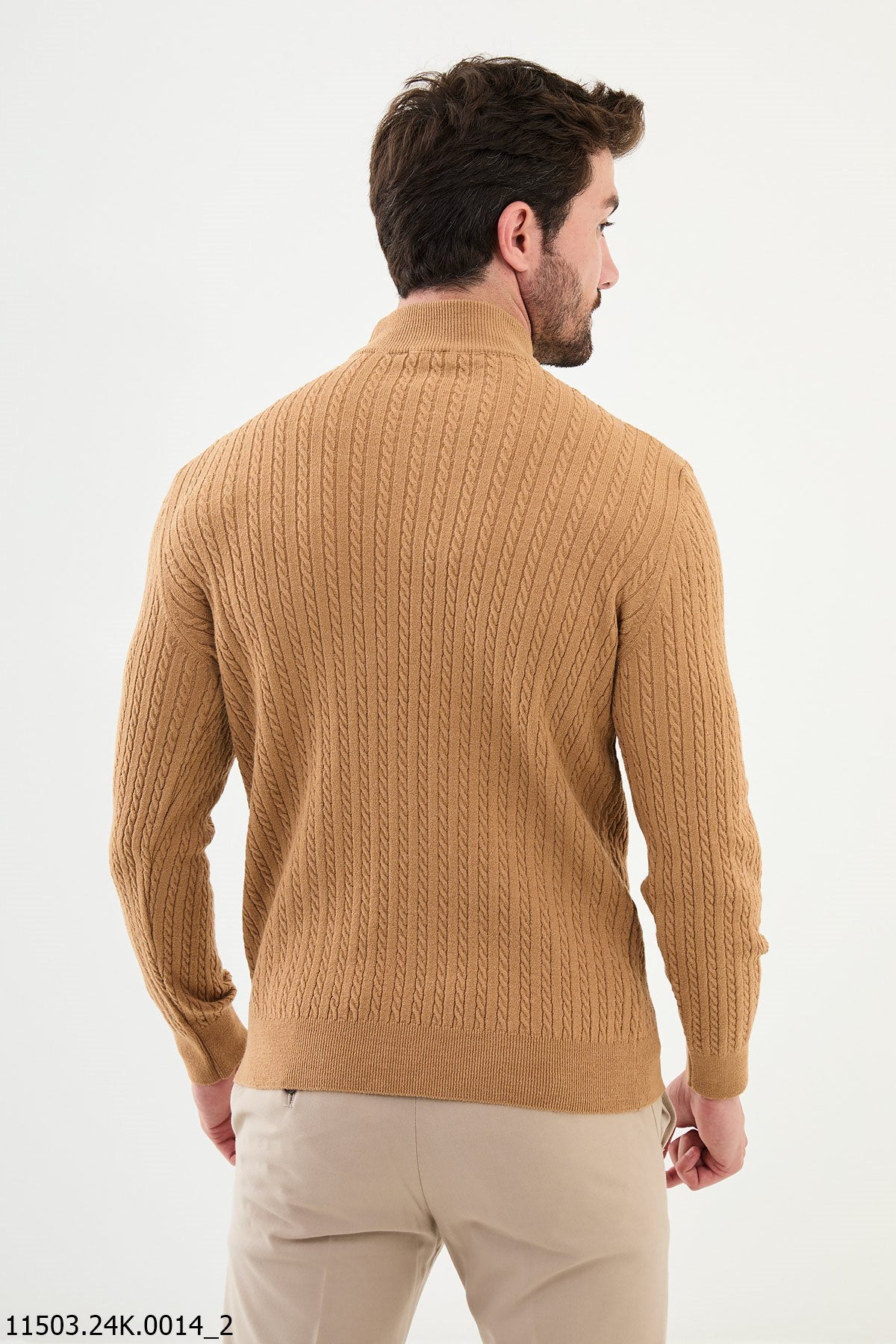 Style meets warmth in this finely knit camel turtleneck sweater. Crafted from a breathable cotton-polyester blend (55% cotton, 45% polyester), it features an intricate cable-knit design that adds texture and depth. The high-neck construction ensures warmth while offering a sleek, refined aesthetic. Pair it effortlessly with tailored trousers or denim for a polished cold-weather look.