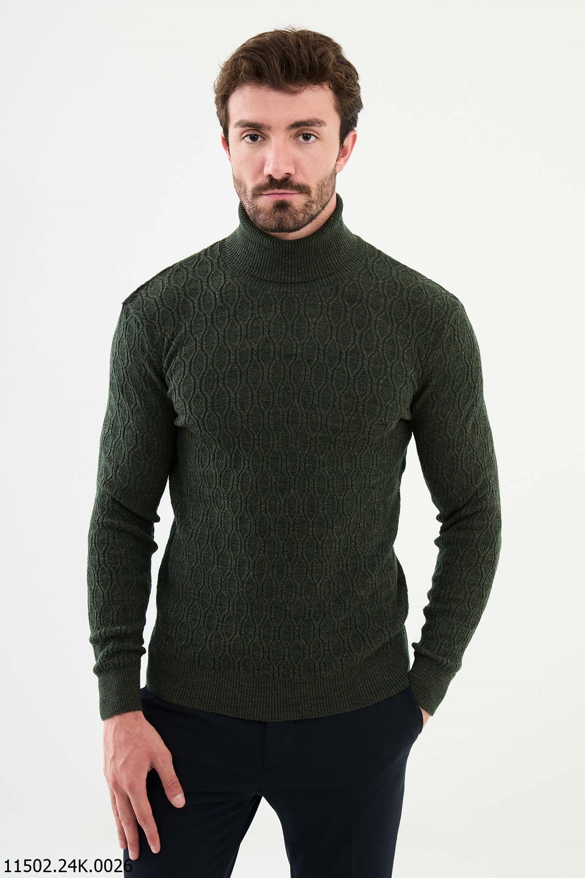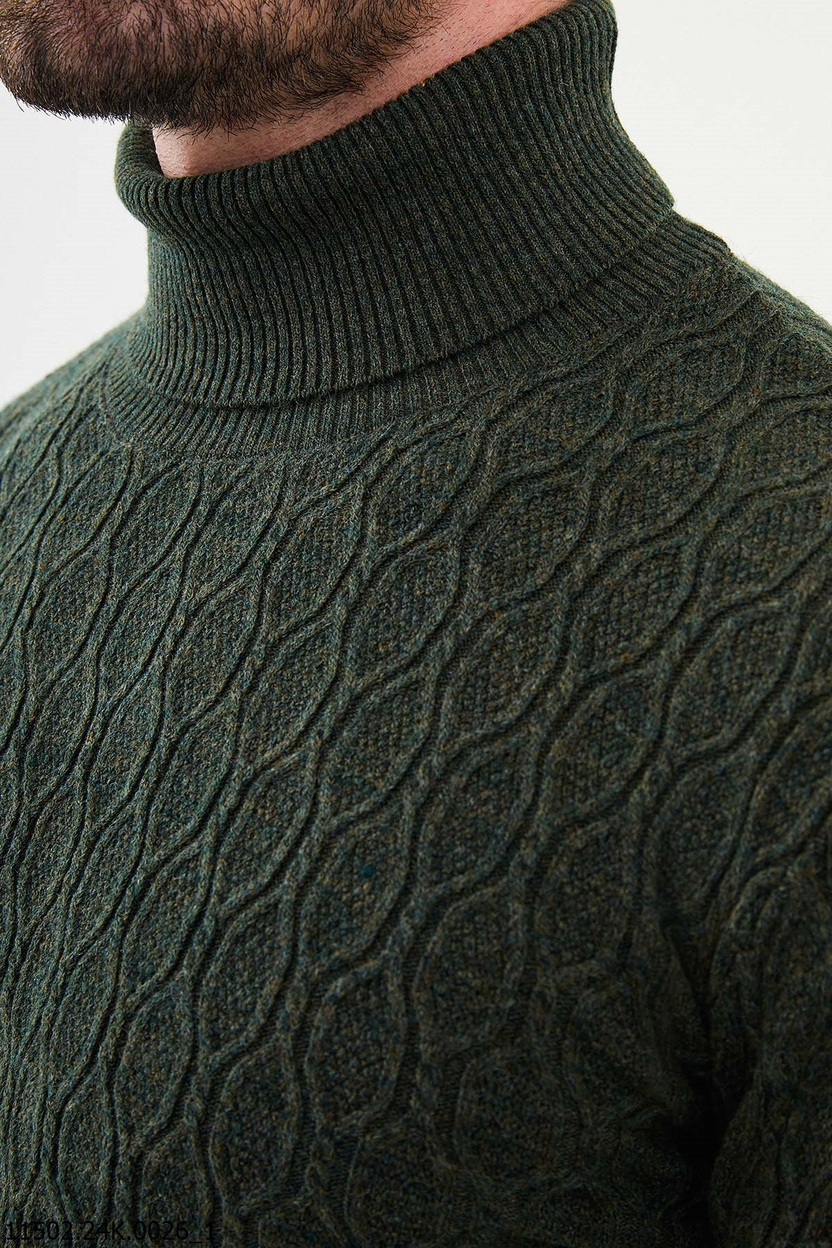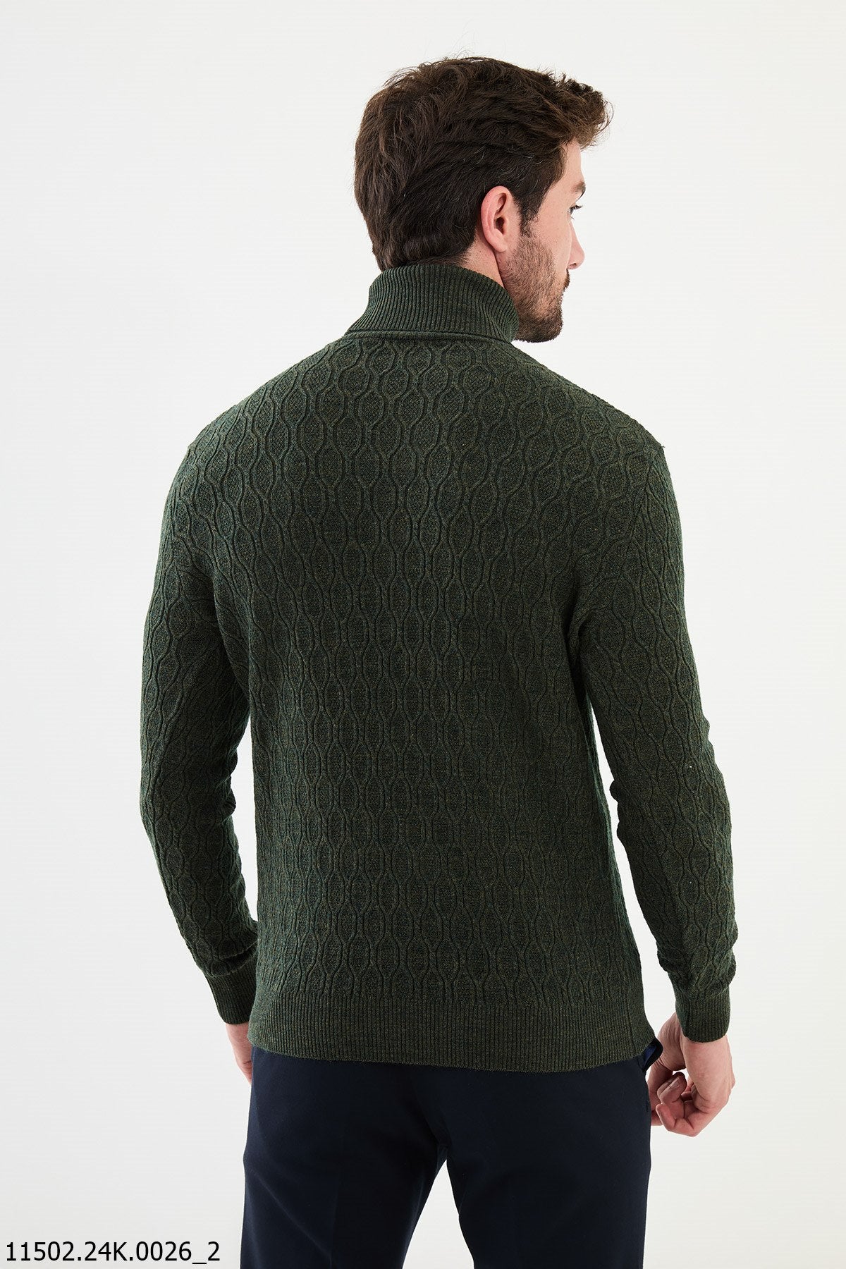 HolloMen Olive Green Textured Knit Turtleneck Sweater.
