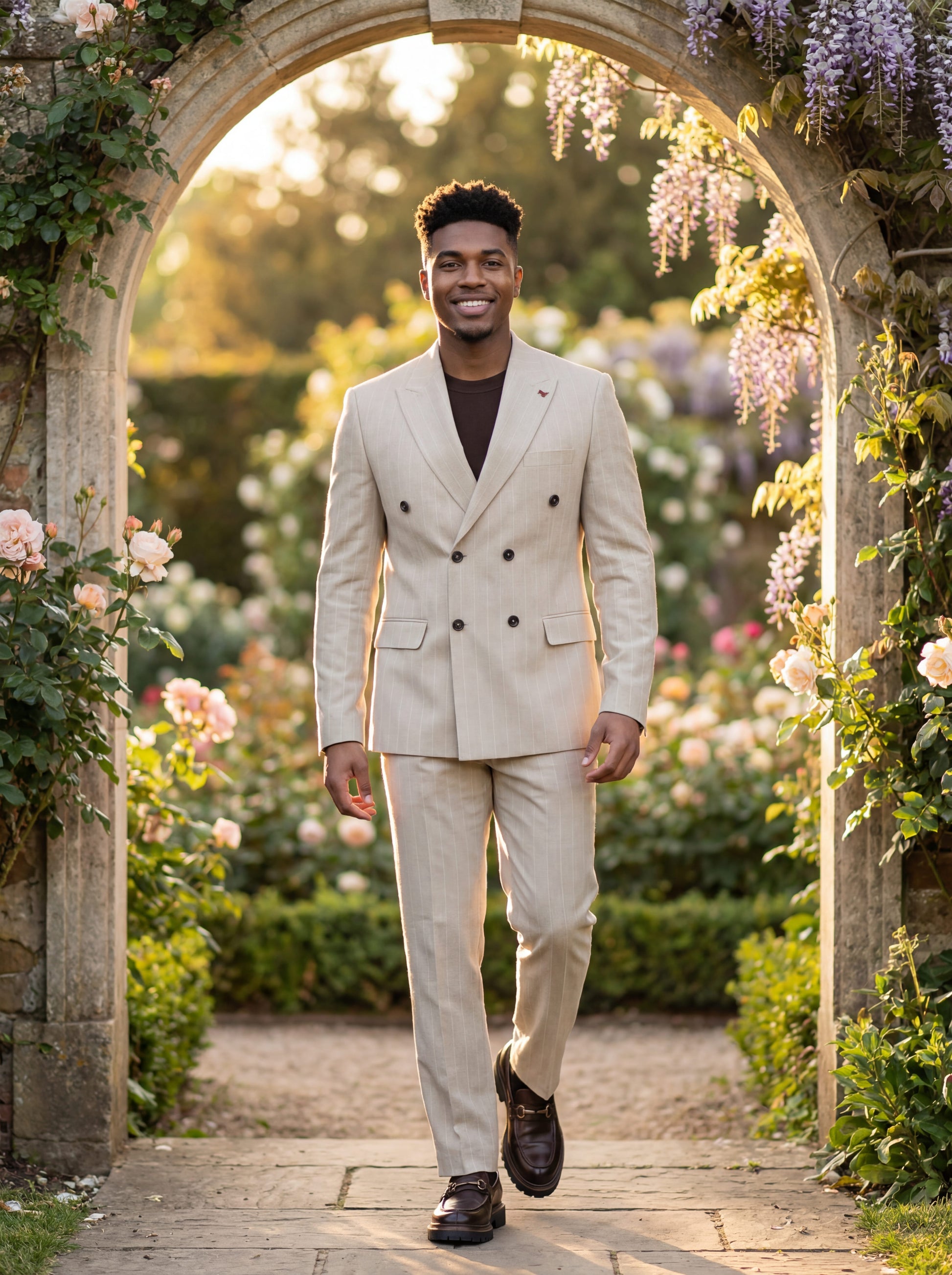 Make a confident, refined statement on prom night with this Beige Double-Breasted Pinstripe Prom Suit, designed for modern prom shoppers who want to stand out without going too bold. The soft beige tone offers a fresh alternative to traditional black while still looking sharp under venue lighting and in professional photos. Subtle pinstripes add depth and elegance, giving this suit a polished, upscale presence that feels intentional and stylish.