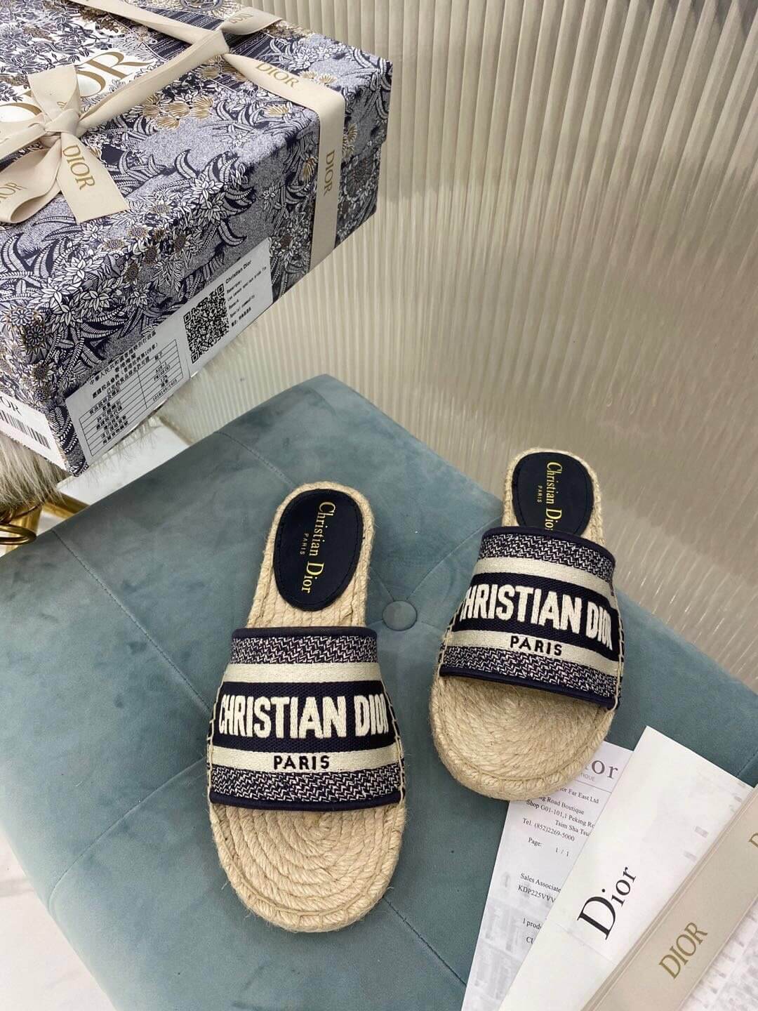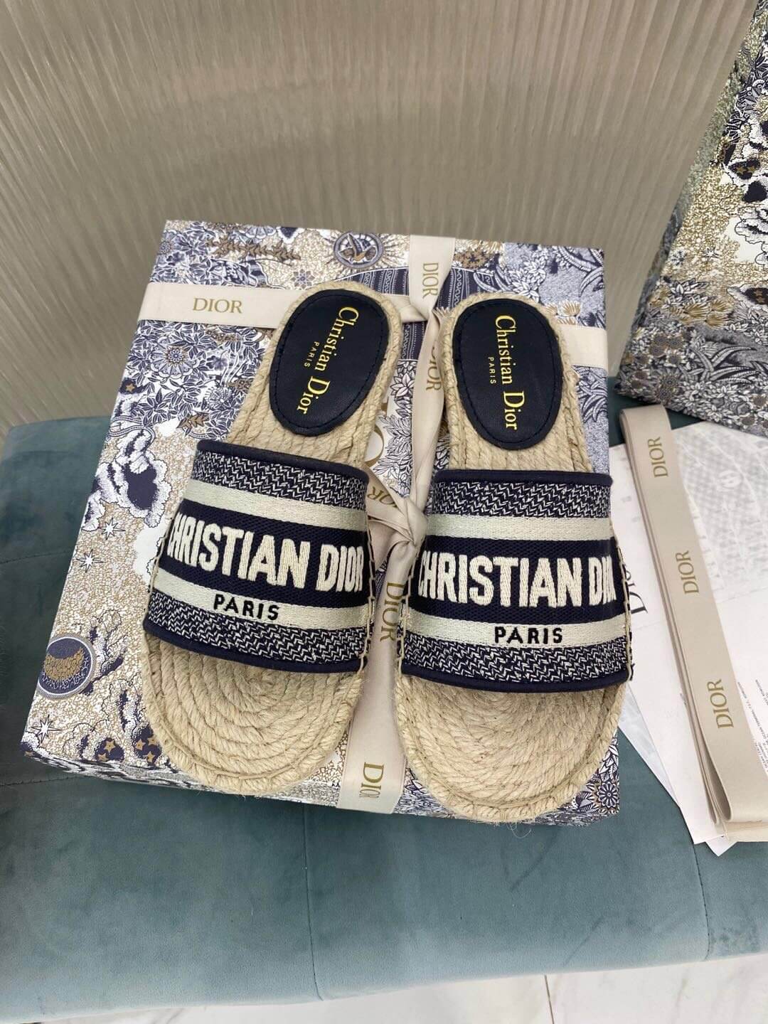 Christian Dior Canvas Embroidered Granville Espadrille Flat Slide Sandals Black and White