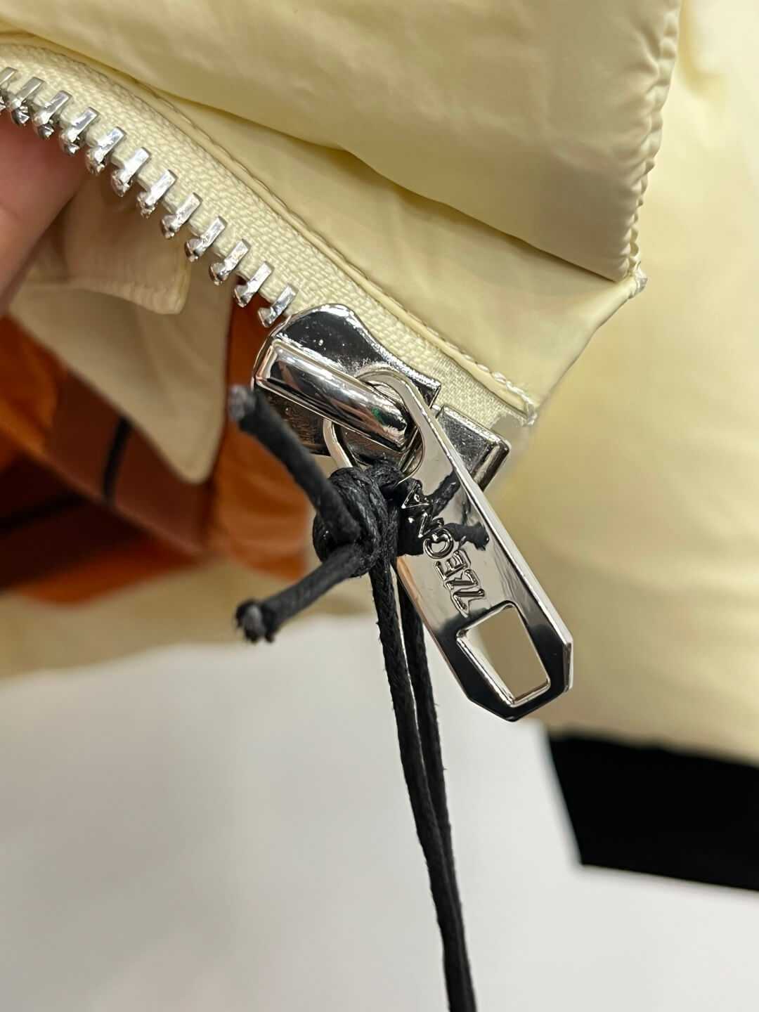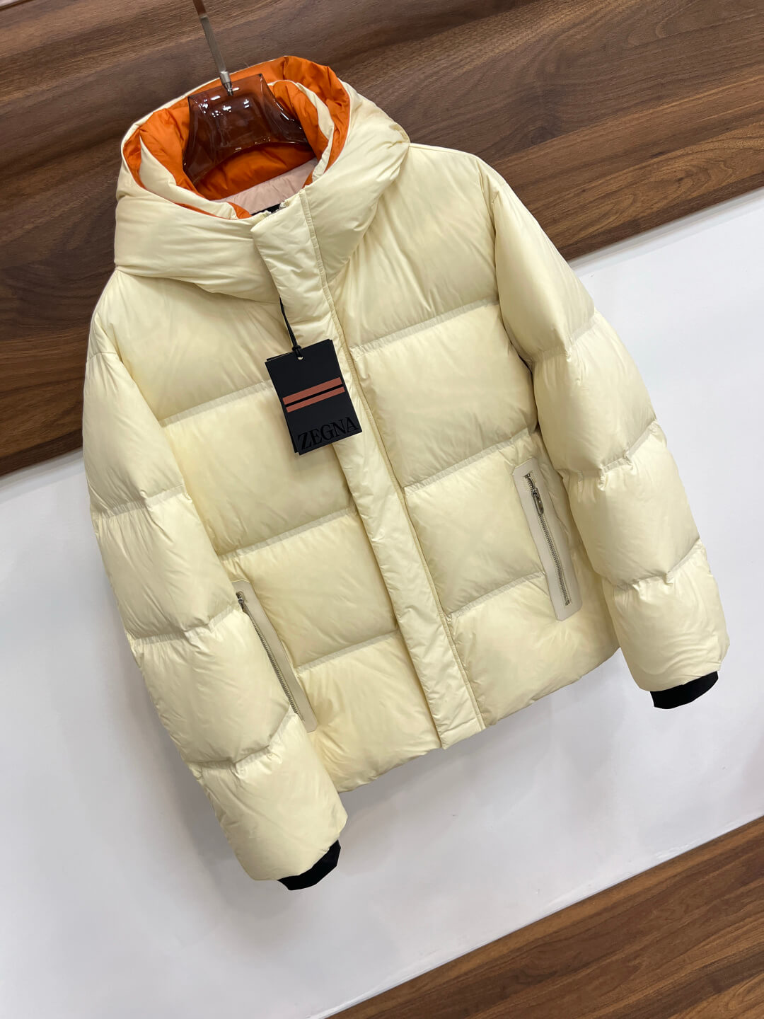 This jacket is the definitive piece for the individual who seeks dependable warmth, clean luxury, and a striking, contemporary design. The crisp cream outer shell provides an instantly elevated, refined look, while the hidden vibrant orange lining adds an unexpected pop of color and modern flair. Blending exceptional insulation with Zegna's signature polished aesthetic, this jacket is the perfect outer layer to transition through cooler seasons with effortless style.