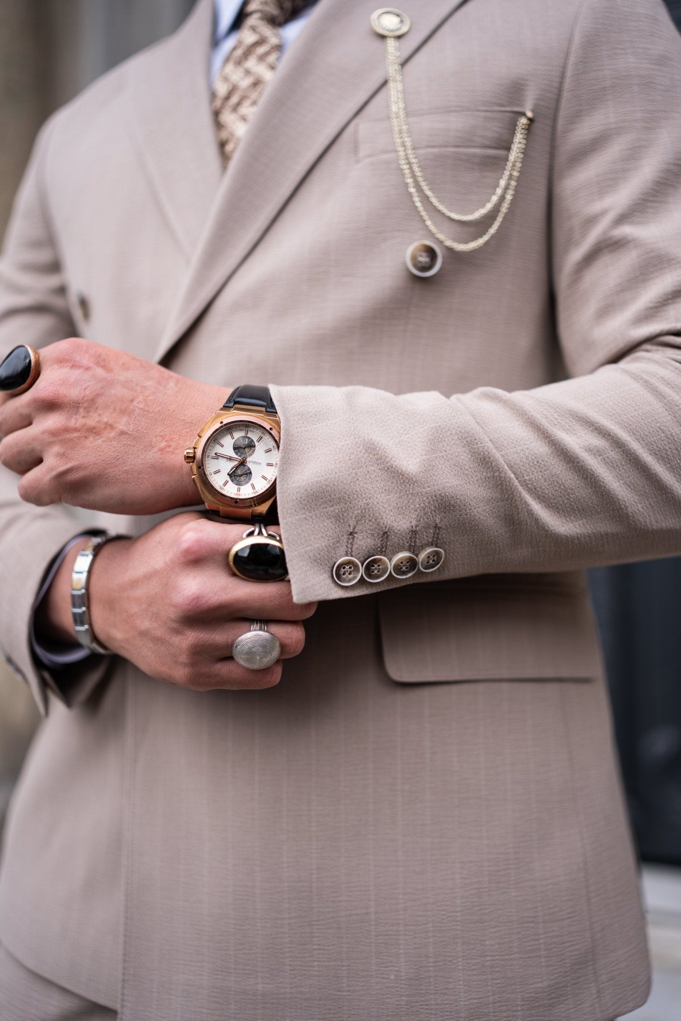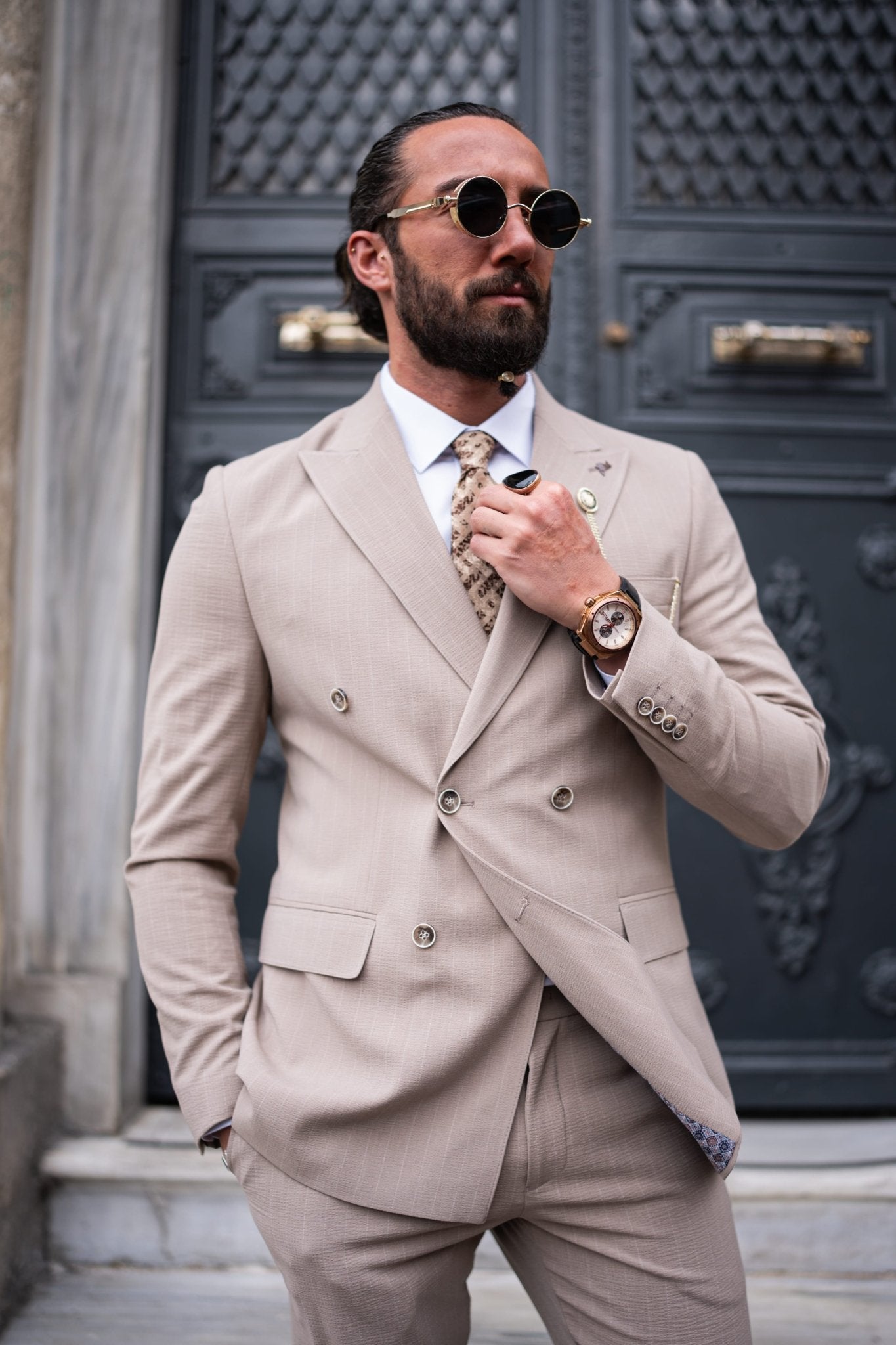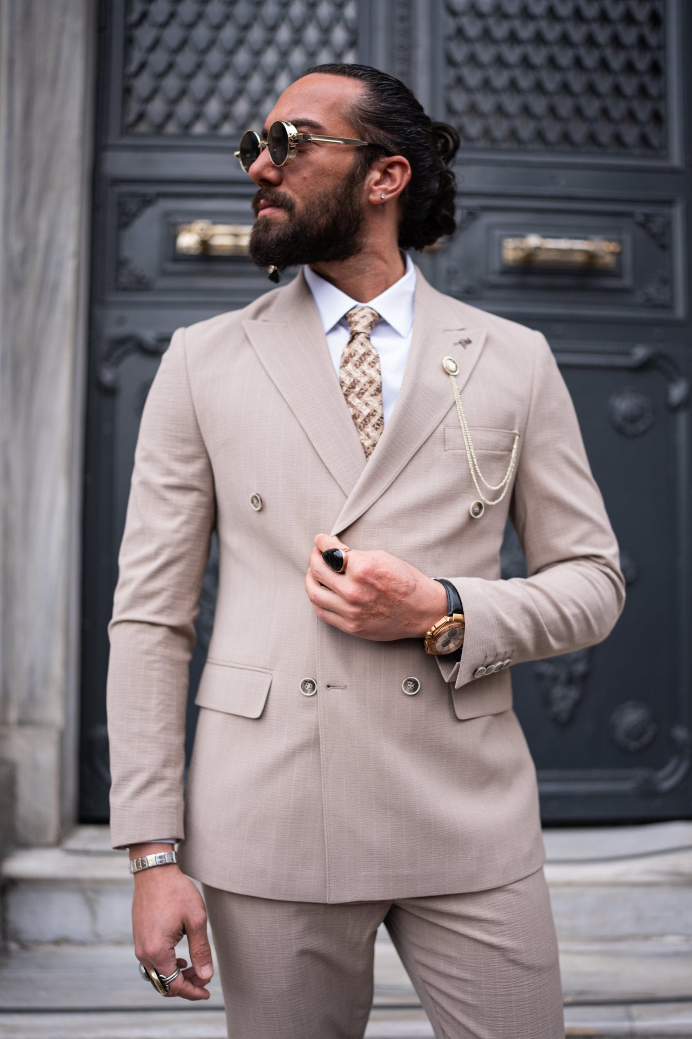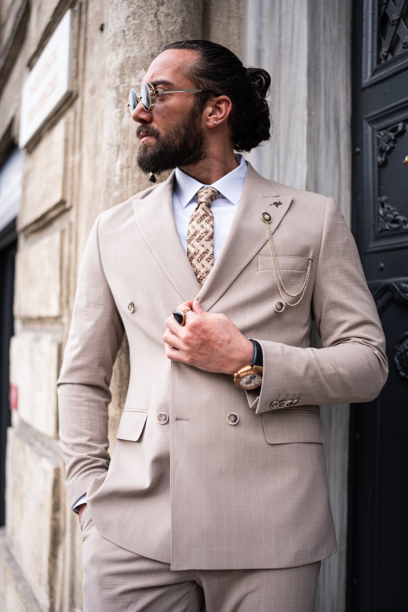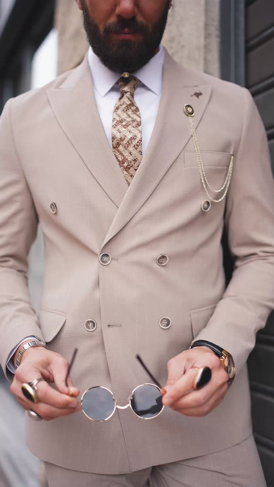 Make a bold statement of refined elegance with our Double Breasted Striped Beige Suit. Crafted for the discerning gentleman, its classic yet contemporary design exudes undeniable sophistication.