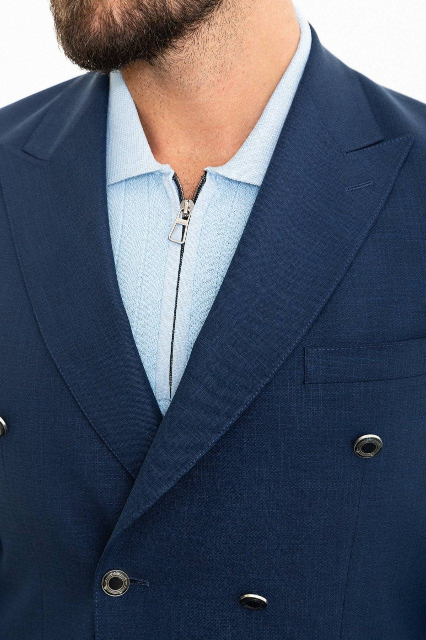 Introducing the HolloMen Navy Blue Double-Breasted Blazer—a masterpiece of modern tailoring. Featuring a sharp double-breasted front, this blazer exudes confidence and sophistication, making it a versatile choice for both business and evening wear.