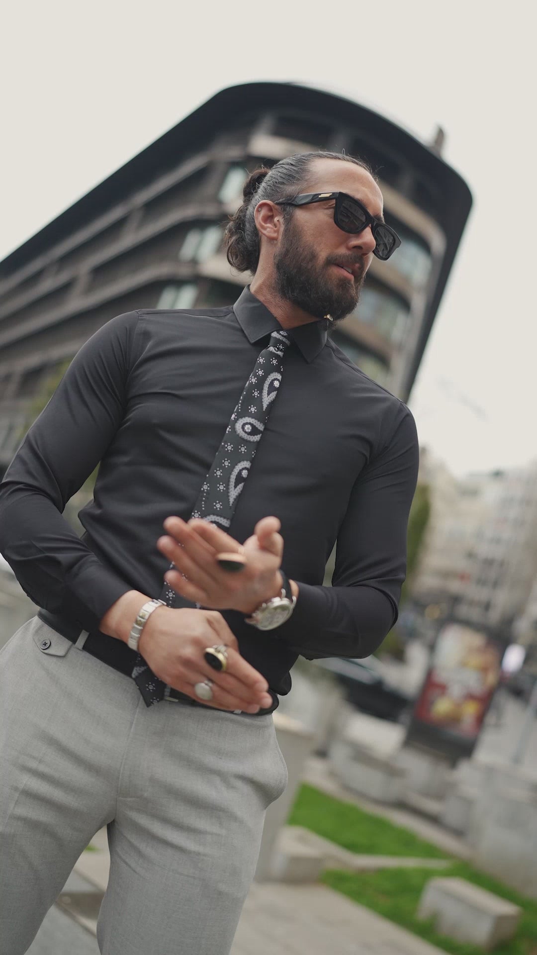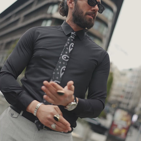 We're Featuring a Special Design Slim Fit Black Satin Lycra Shirt.