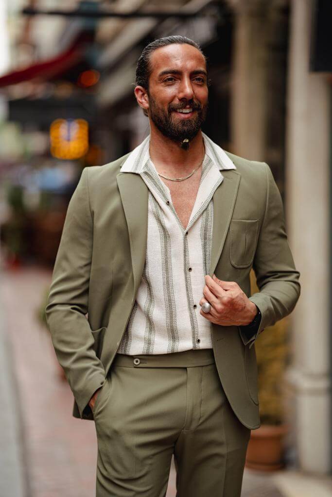 Our model, standing at 182cm and weighing 78kg, showcases the suit Jacket size EU50/US40 And Pants Waist size 32. For your perfect fit, please provide your height and weight during purchase.