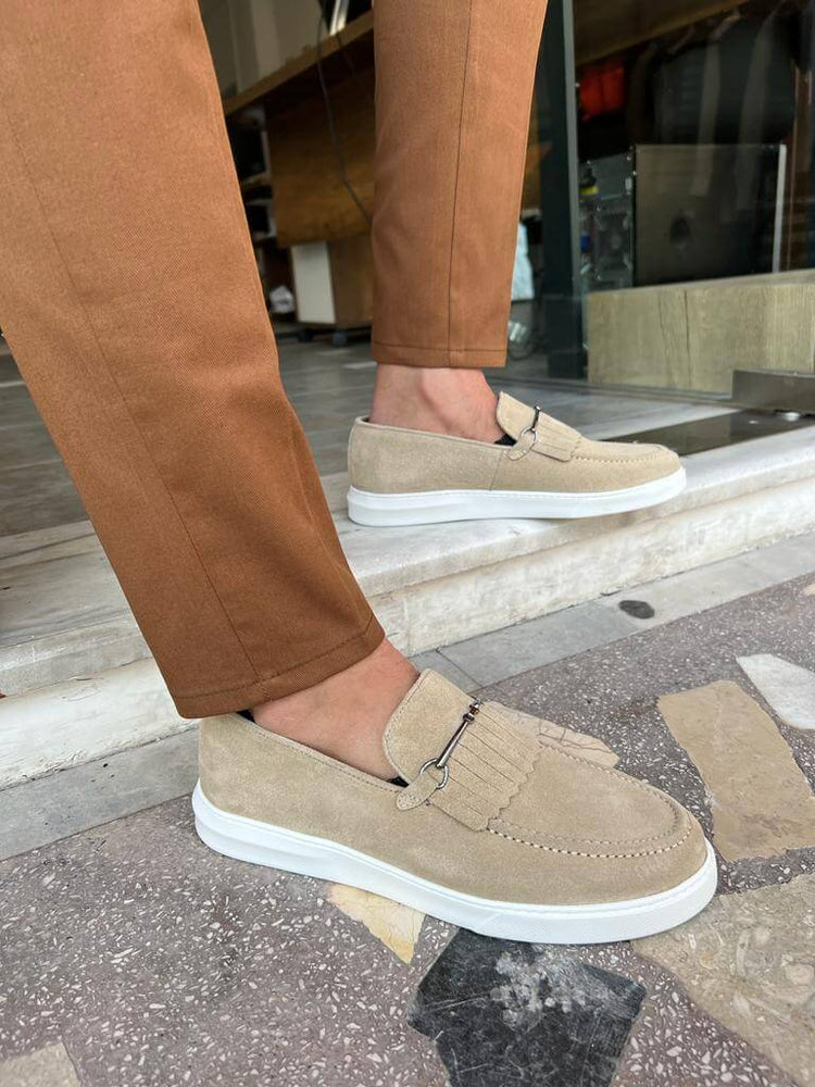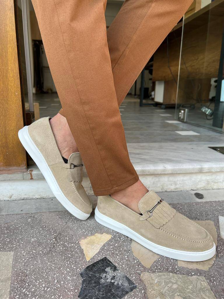 Primavera Verão 22 temporada, com mocassim de camurça bege.