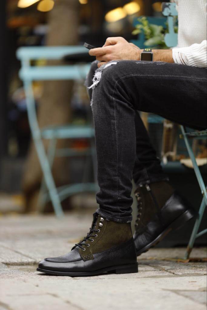 Chame a atenção com as Botas Aspen Pretas e de Camurça Caqui – uma fusão de estilo robusto e artesanato refinado. Apresentando uma mistura dinâmica de couro preto com textura croco e camurça caqui, este design de cano alto foi criado tanto para uma confiança casual como para um visual urbano sofisticado.