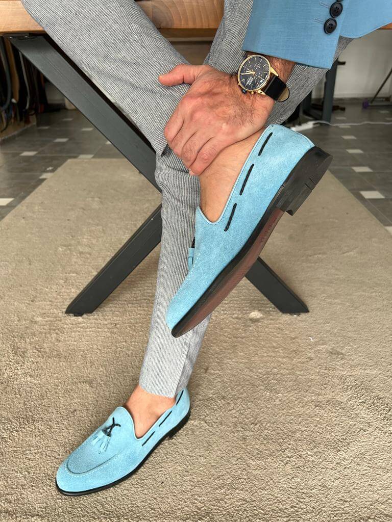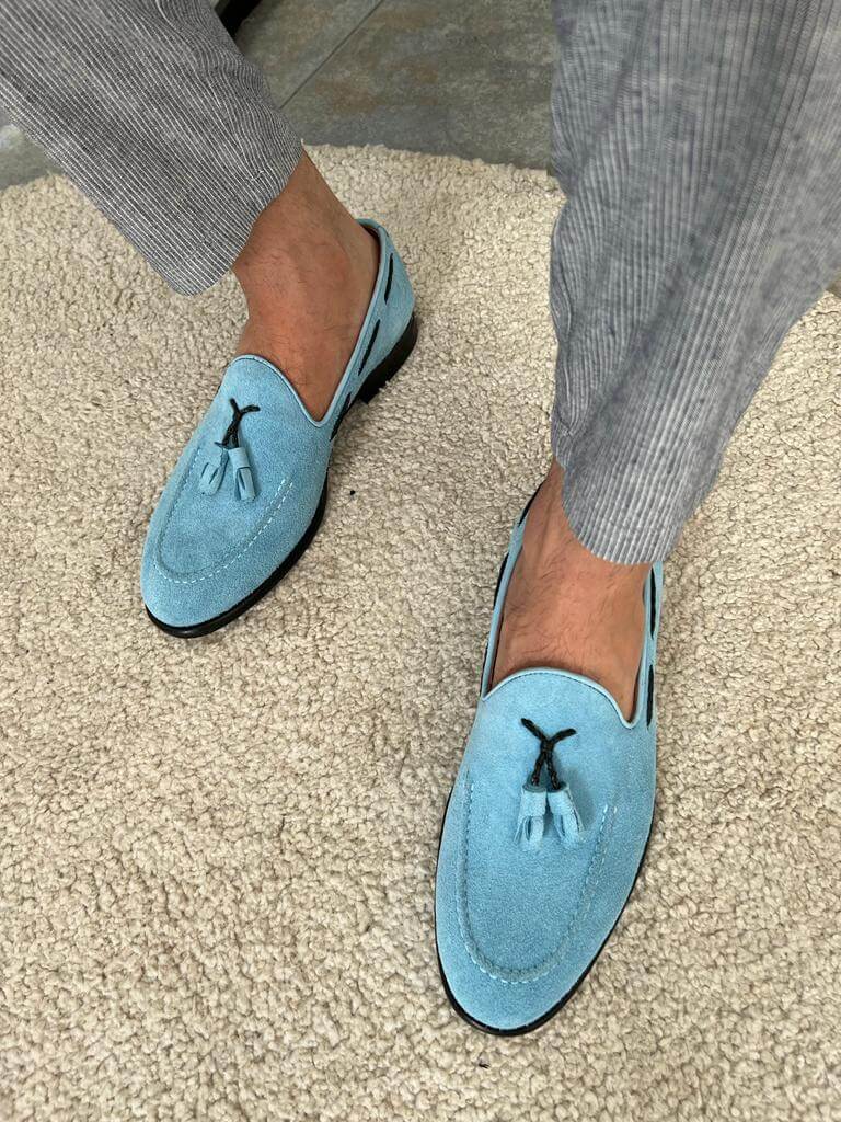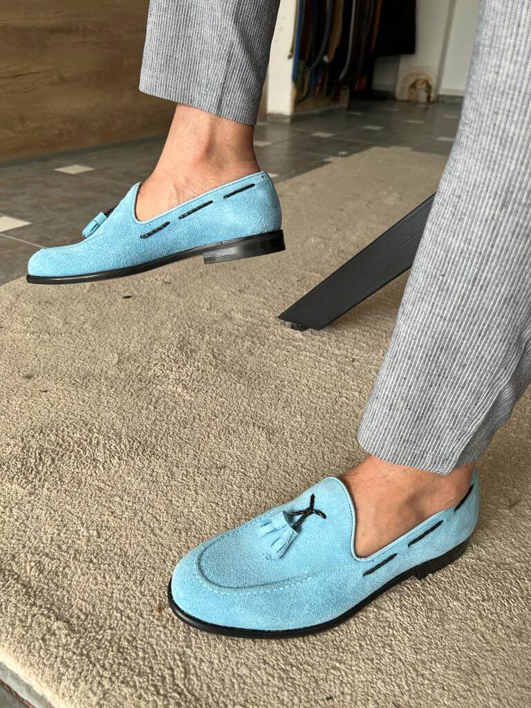 Com borla de camurça azul mocassins. Eles são feitos de couro 100% camurça e sola neo-lite.