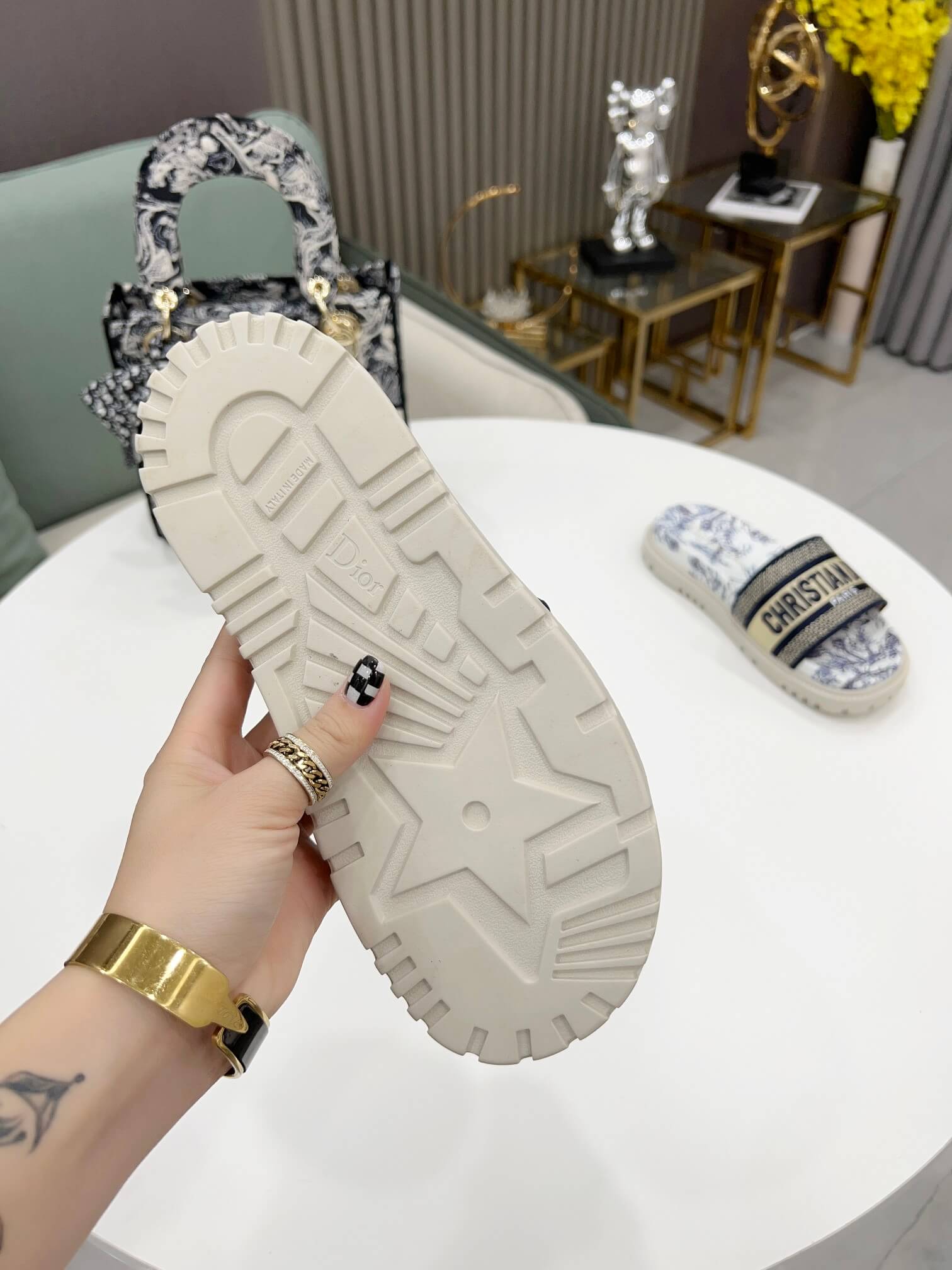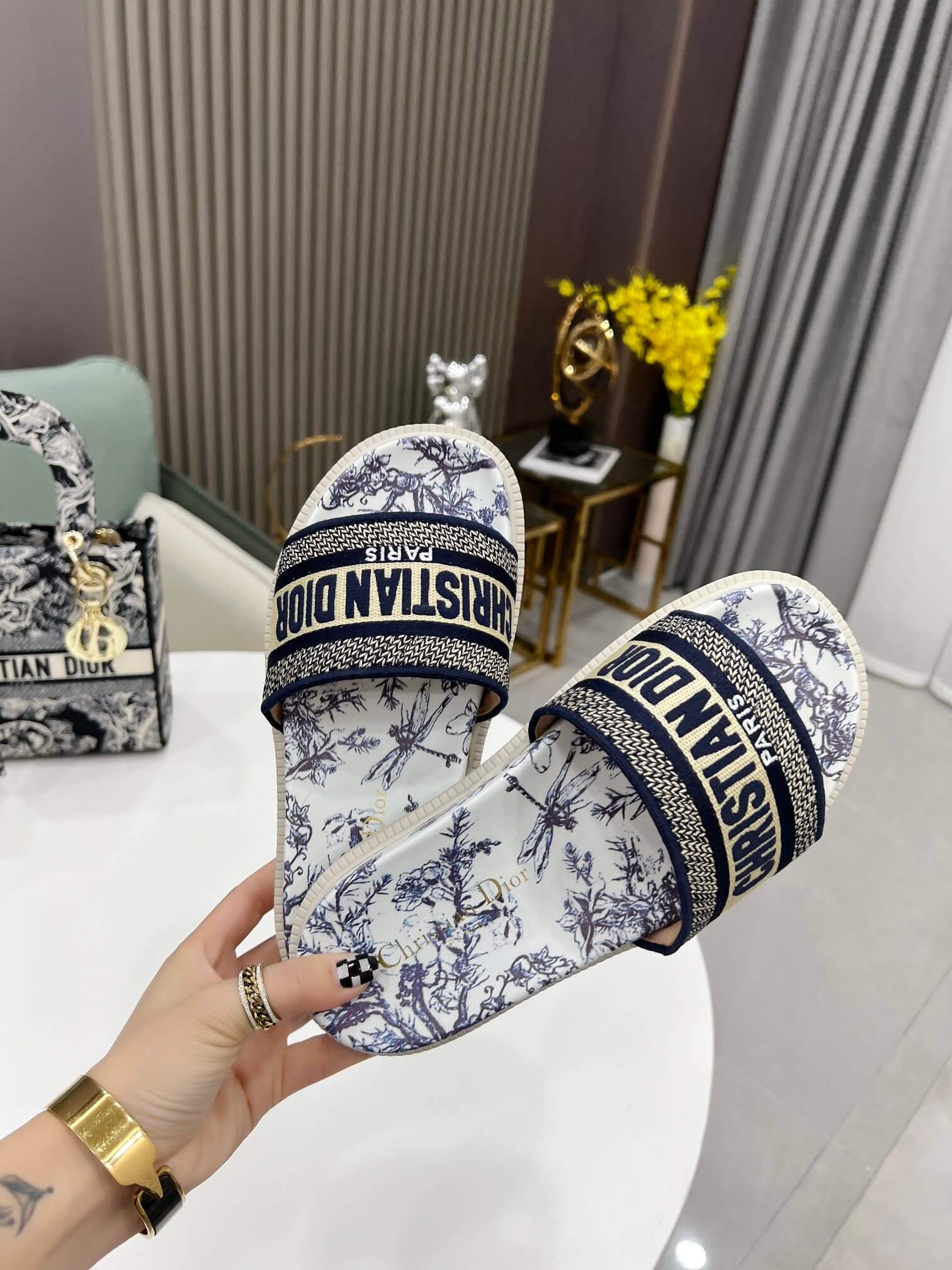 Dior D-Way Navy Blue and White Toile de Jouy with Cream Embroidered Strap Slide