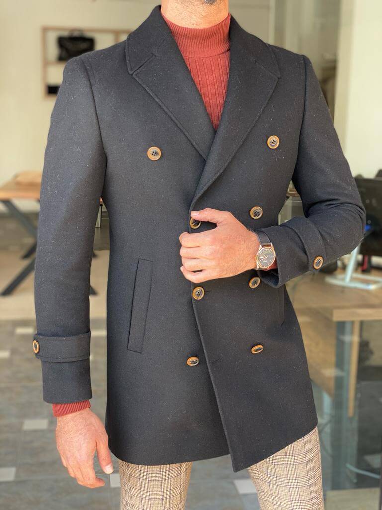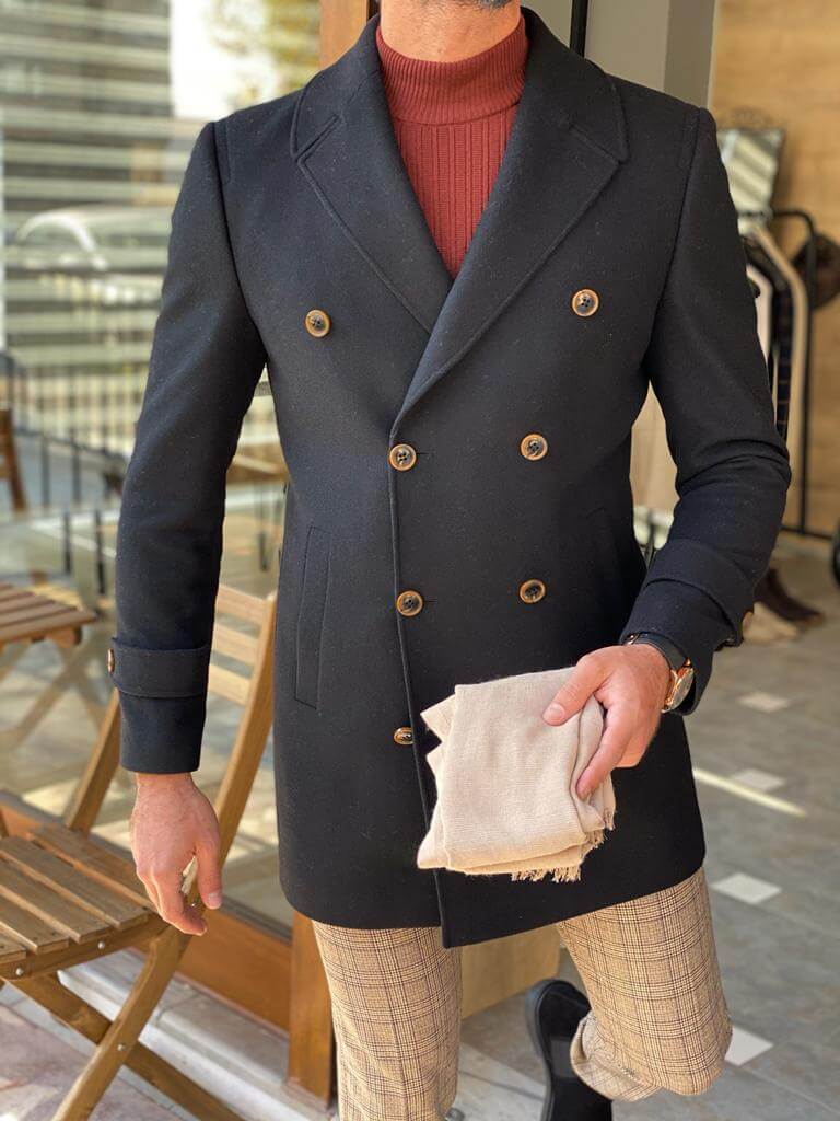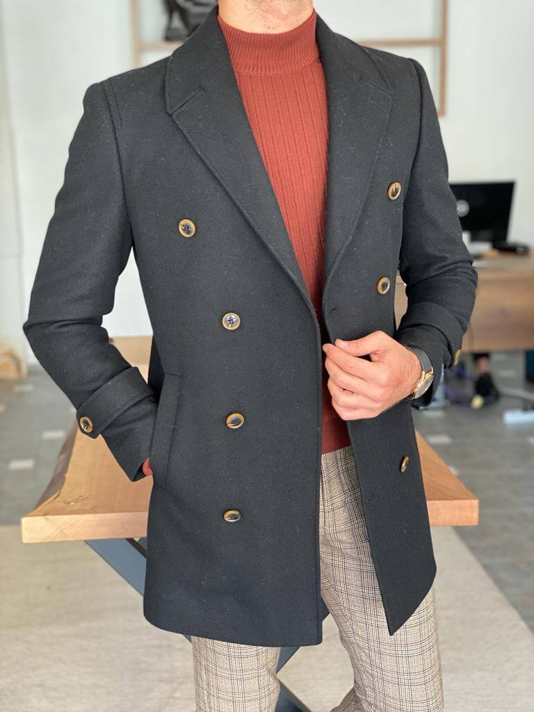 Este casaco de lã preto trespassado slim fit é uma chegada especial para a temporada de casacos de inverno 21/22 aqui na HolloMen.