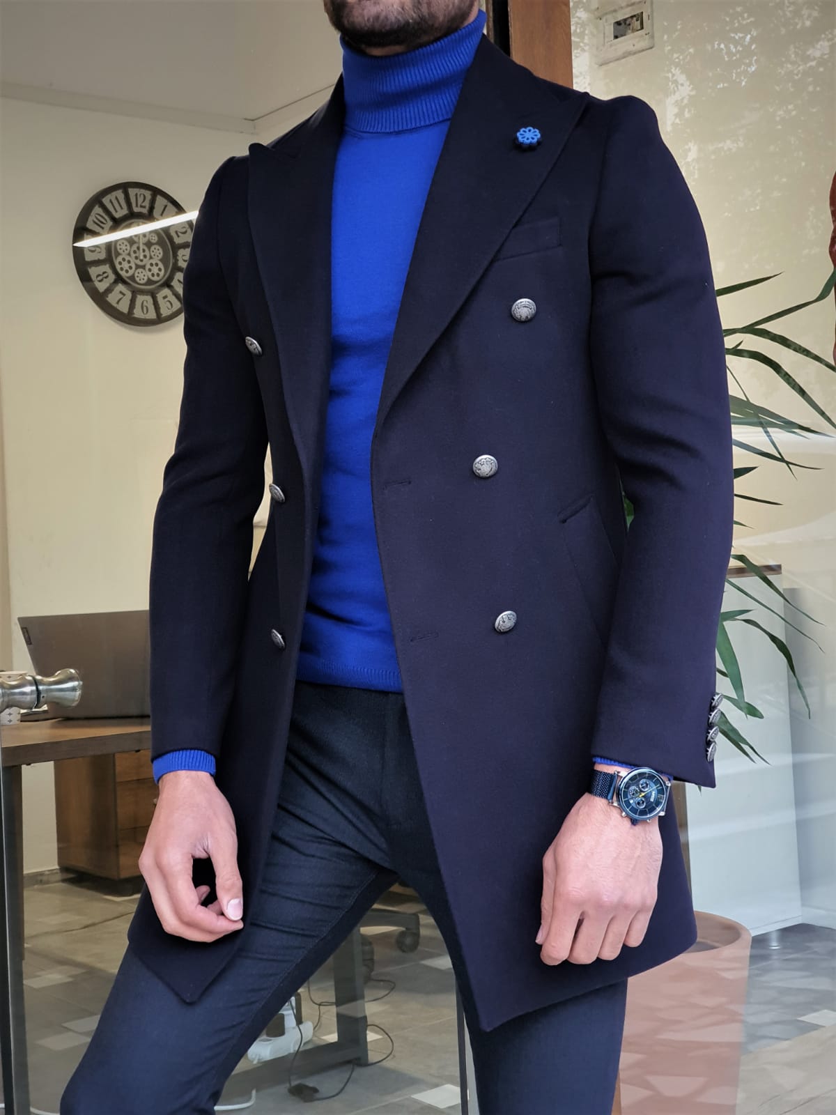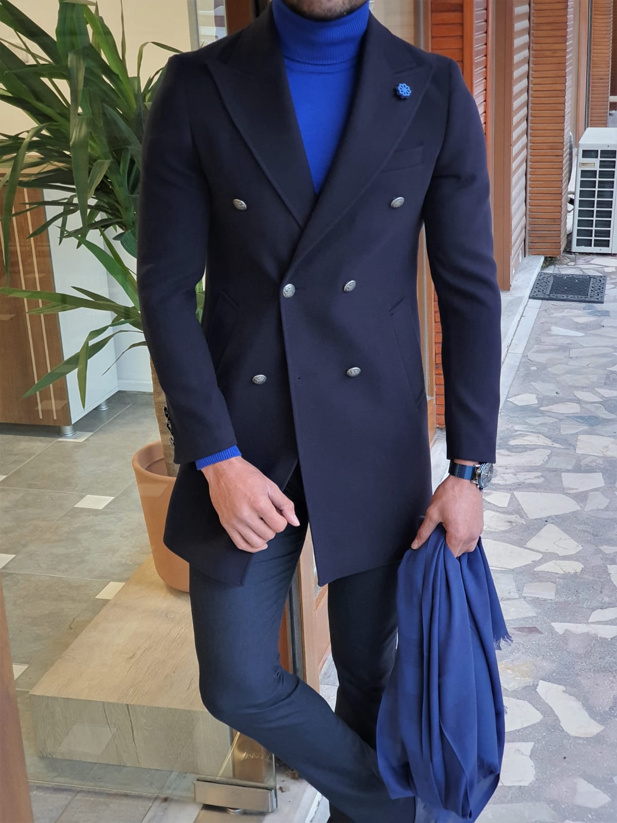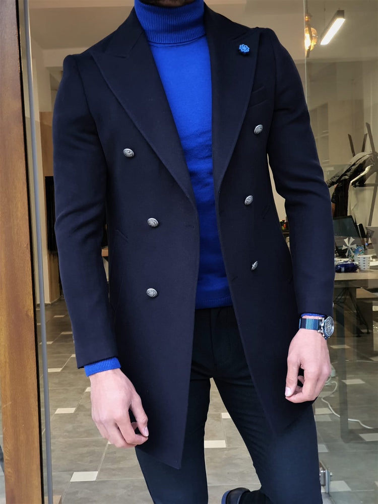 Your package will include the sophisticated navy blue wool coat, perfect for the season.