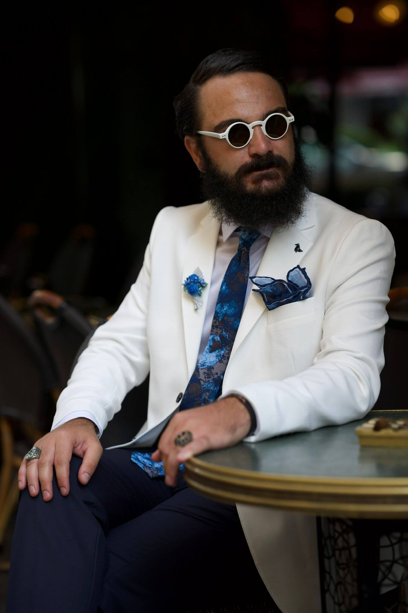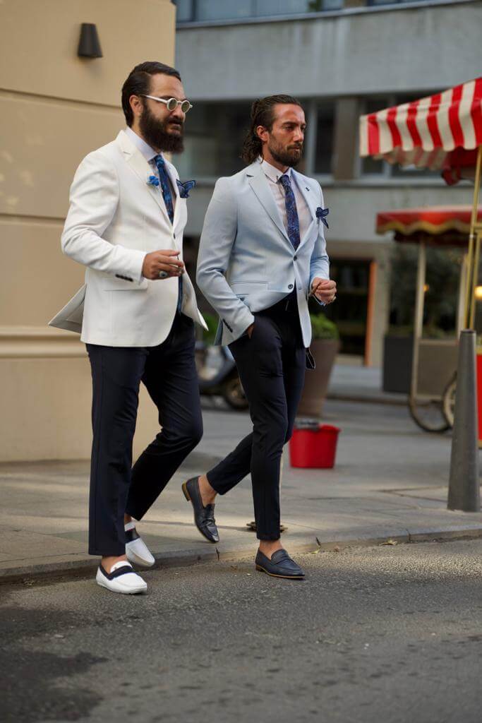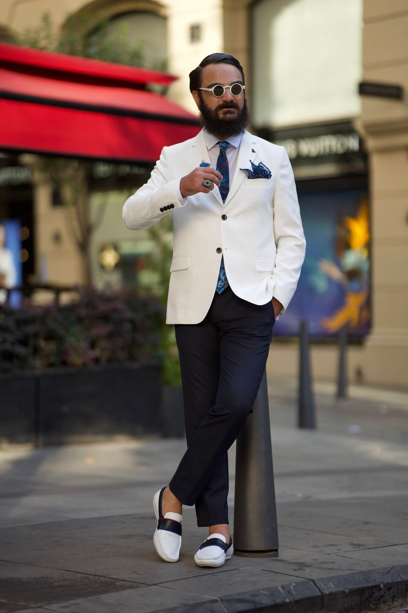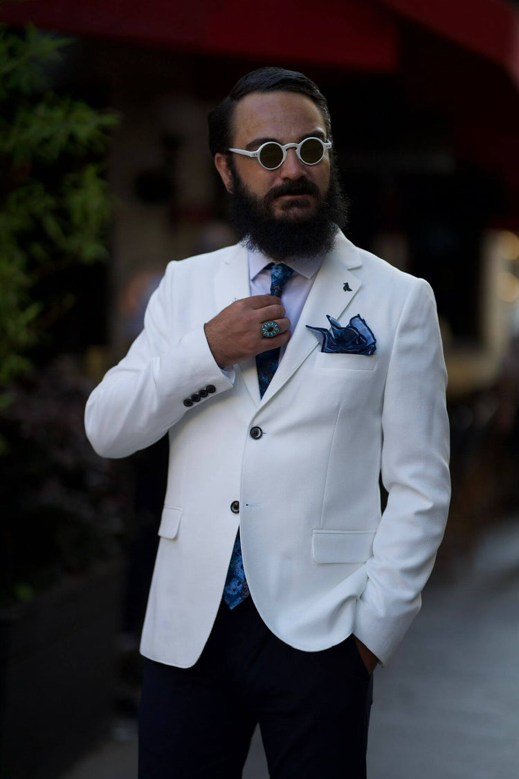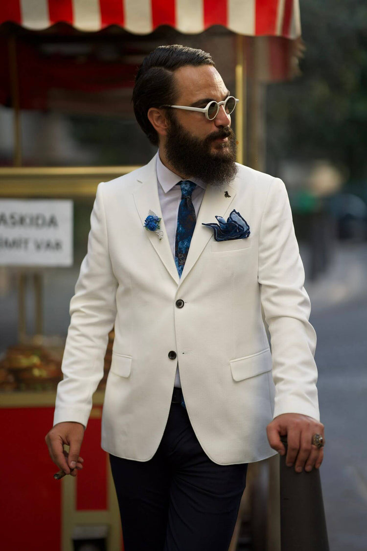 Com uma jaqueta blazer branca de gola mono,