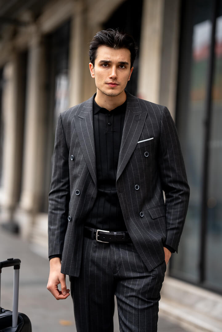 Asociați-l cu o cămașă neagră clară și o curea elegantă din piele pentru un aspect monocrom care emană încredere și farmec. Lasă măiestria impecabilă și detaliile fine ale acestui ansamblu să redefinească elementele esențiale din garderobă.
