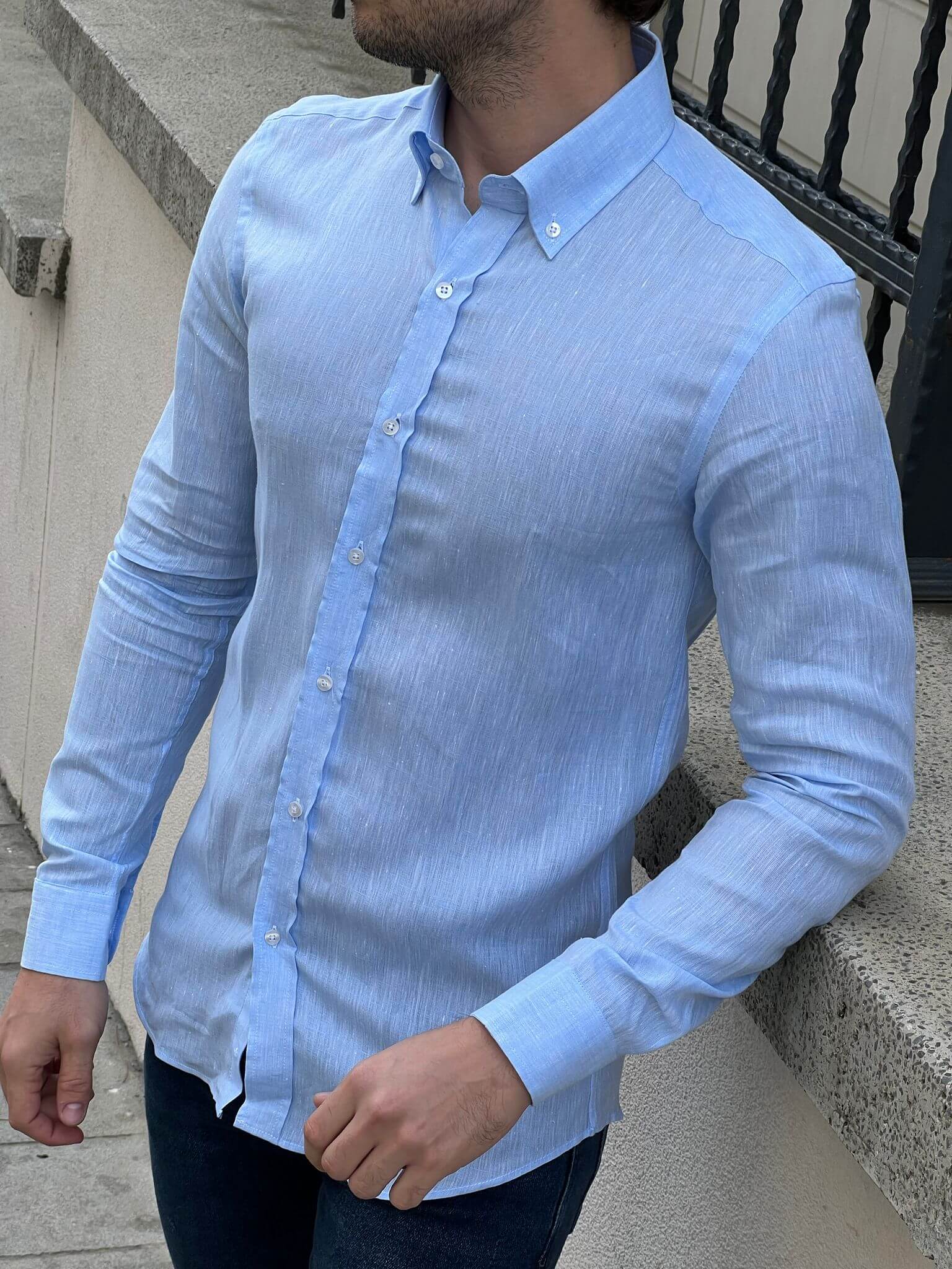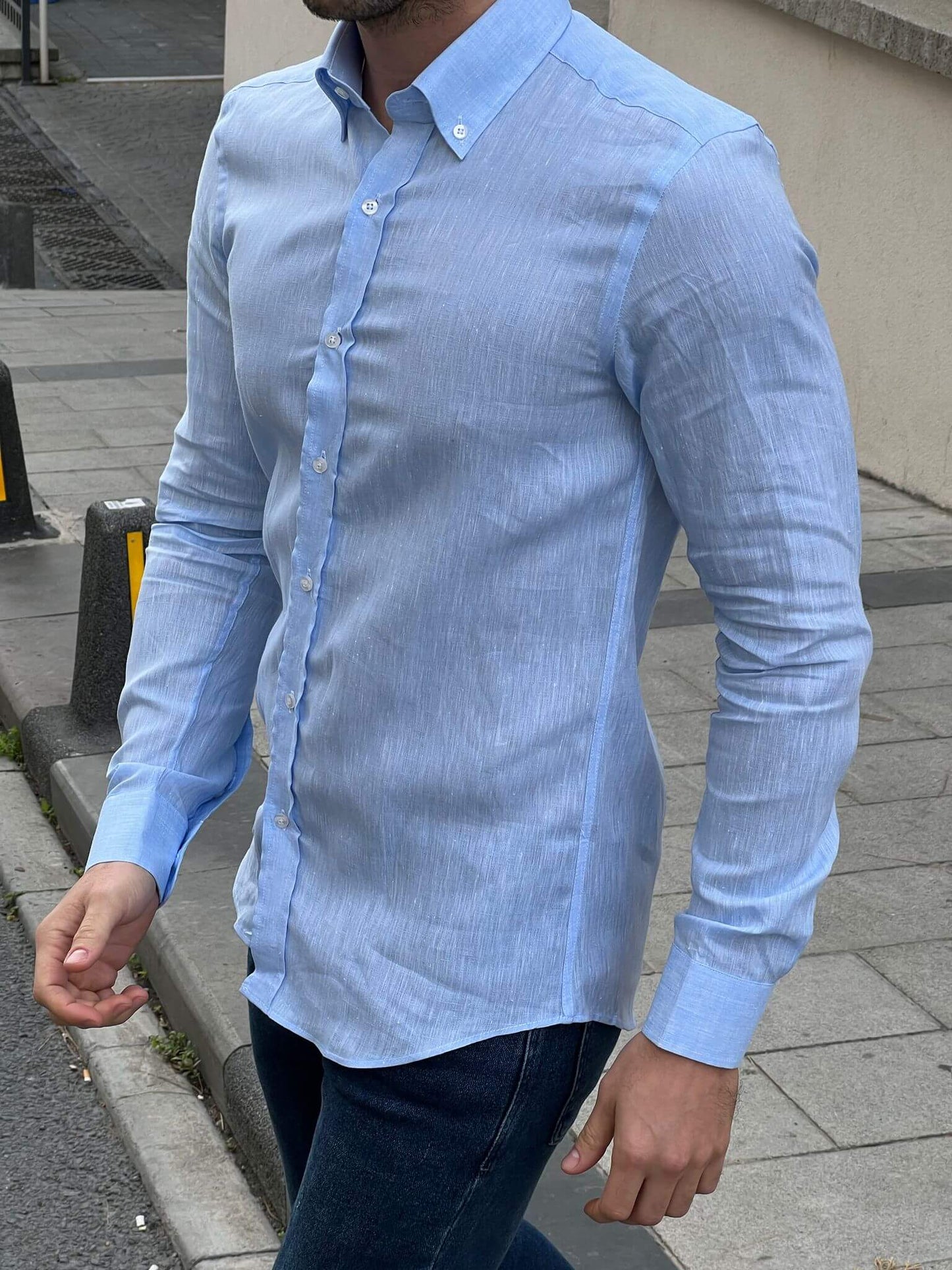 We're Featuring a Special Production High-Quality Slim-Fit Buttoned Collar Blue Linen Shirt