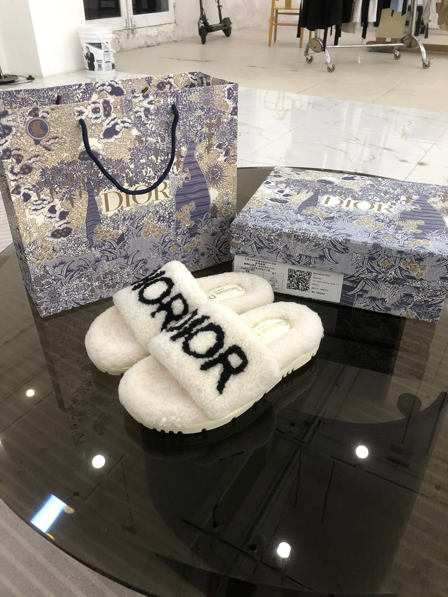 Sandale Christian Dior Dway din blană de shearling albă cu logo negru