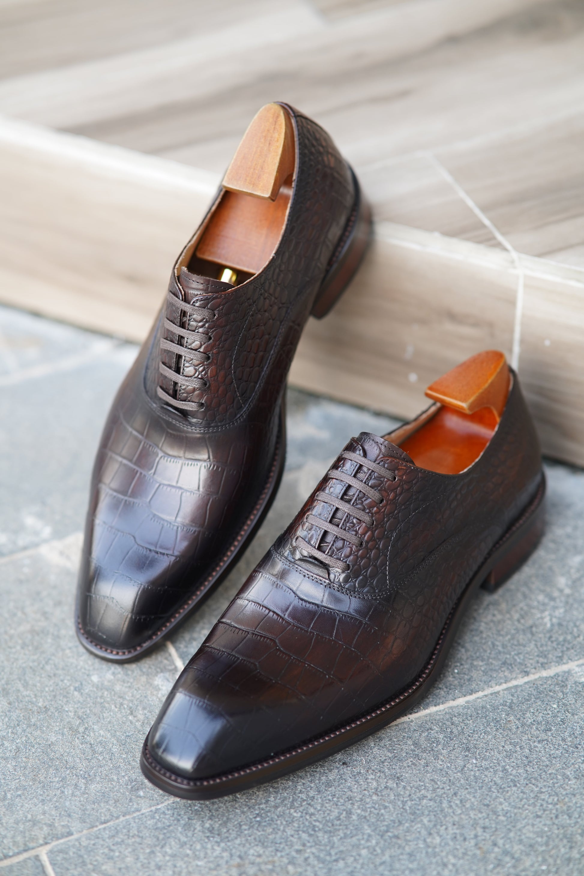 Faceți o declarație de eleganță rafinată cu acești pantofi Oxford lucrați manual, Fabricat meticulos din piele de lux. Adânc, patina închisă adaugă o notă de modă high-end, în timp ce modelul de crocodil în relief emană rafinament.