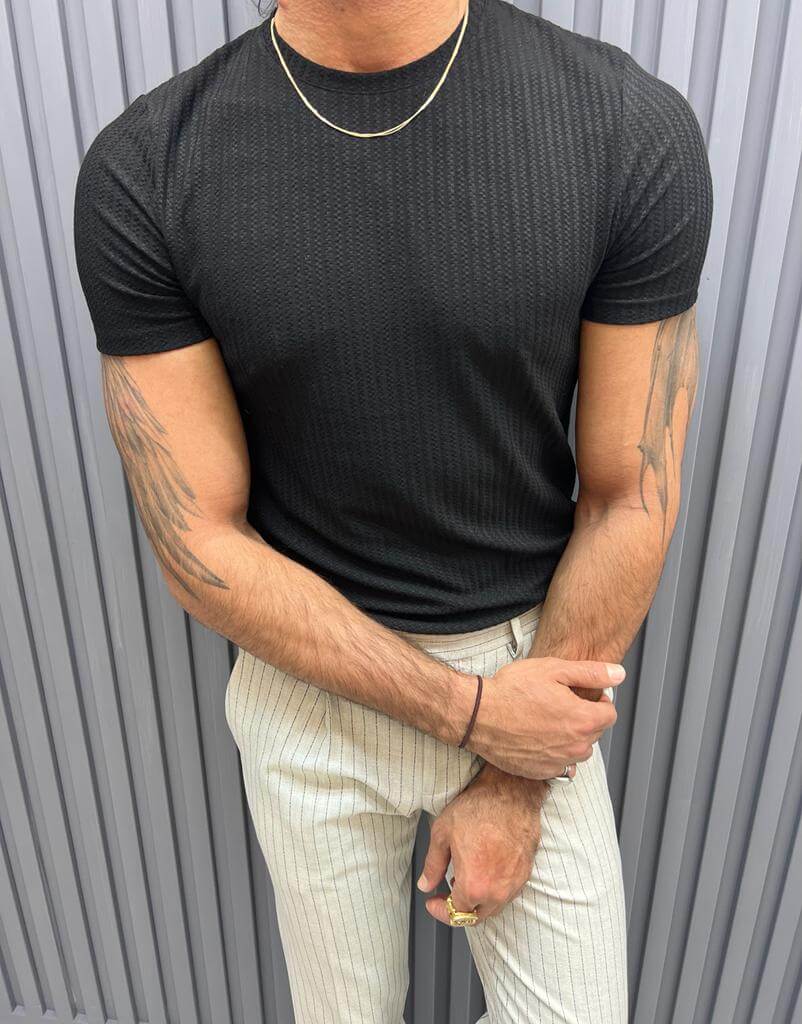 Tricoul este de culoare neagră, iar materialul său include 95% bumbac și 5% elastan.