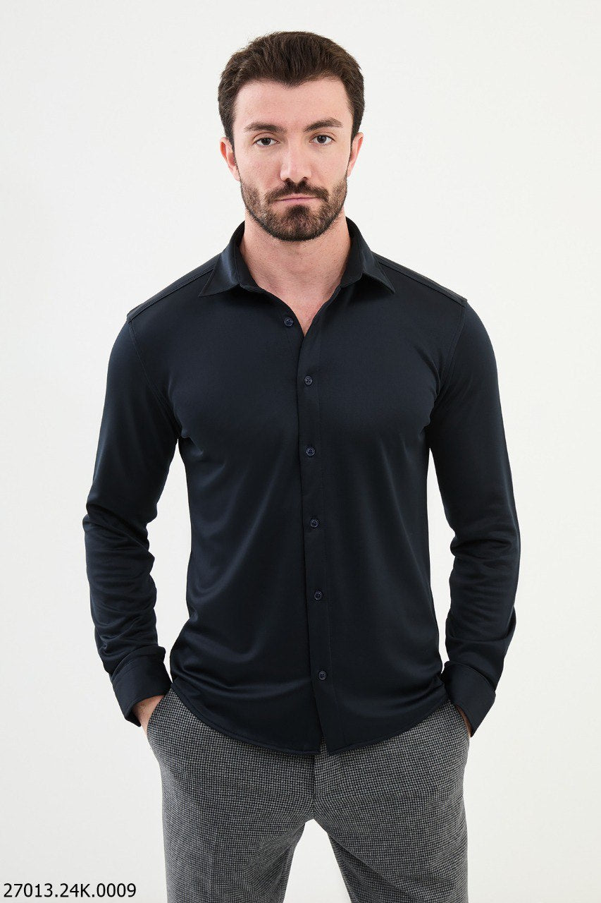 Step into sophistication with this navy blue tailored shirt, made from a premium blend of 55% cotton and 45% polyester, ensuring a soft, breathable, and wrinkle-resistant finish. Designed with a sharp collar and precise stitching, this shirt delivers a clean, polished look for formal occasions or smart casual wear. The slim-fit silhouette enhances your profile, offering comfort and style, while the durable fabric ensures long-lasting quality. Perfect for those who value versatile elegance in their wardrobe-essentials.