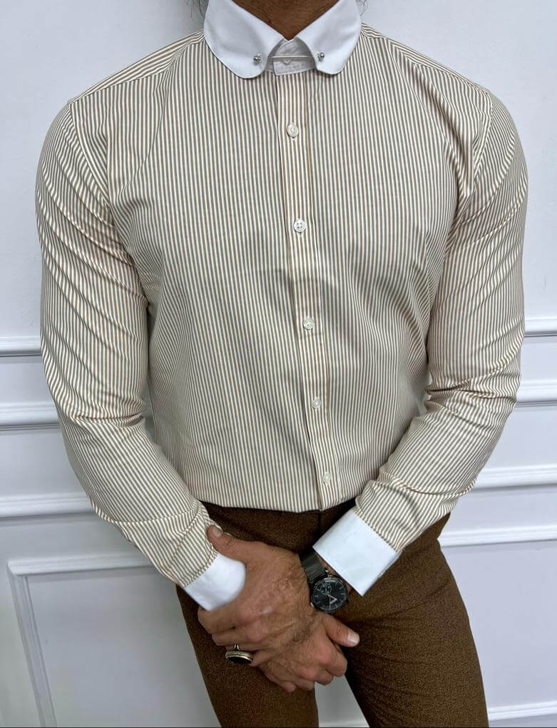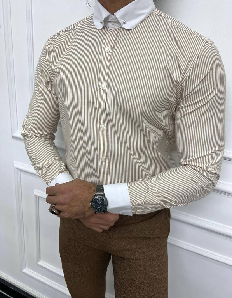 Această cămașă pentru bărbați cu mâneci lungi în dungi bej este completarea perfectă pentru orice garderobă. Fabricat din bumbac 100%, este moale, respirabil și confortabil de purtat toată ziua. Dungile clasice bej și alb adaugă o notă de stil atemporal acestei cămăși, făcându-l perfect atât pentru ocazii casual, cât și pentru ocazii formale. Cu mânecile sale lungi, este grozav și pentru stratificat în lunile mai reci. Indiferent dacă îl îmbraci pentru o seară în oraș sau îl păstrezi casual în weekend, această cămașă va deveni cu siguranță un element de bază în dulapul tău.