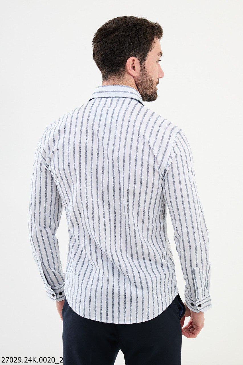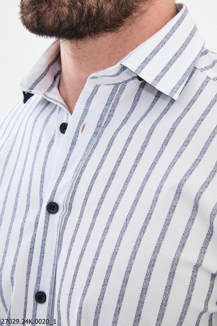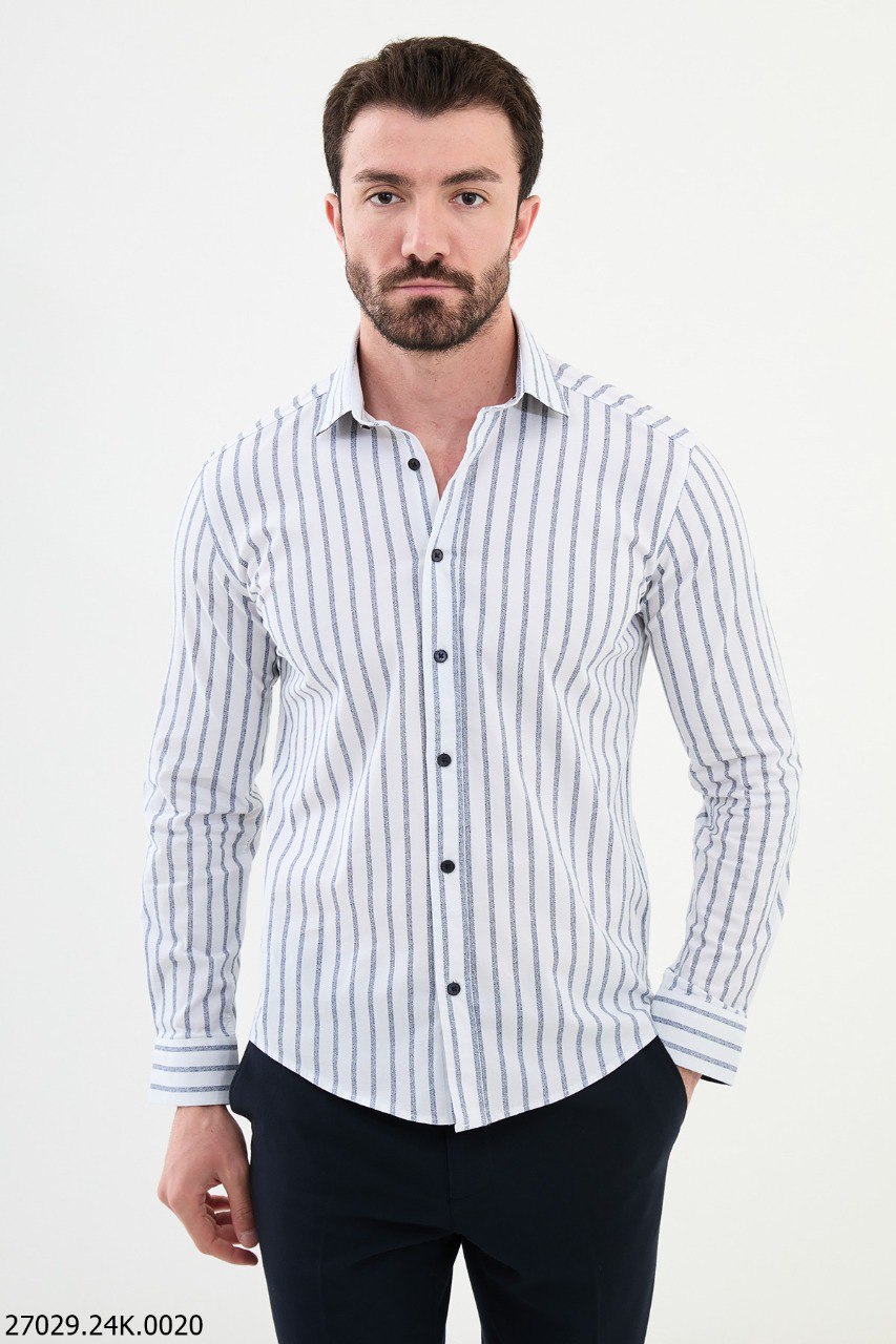 Elevate your wardrobe with this Men's White Striped Business Casual Shirt, a versatile piece perfect for both office settings and relaxed outings. Featuring crisp navy blue vertical stripes on a fresh white backdrop, this shirt exudes sophistication and style. Crafted for the Fall-Winter season, the blend of 55% cotton and 45% polyester ensures durability, breathability, and comfort throughout the day. Designed with a sharp collar and tailored fit, it pairs seamlessly with dress pants for formal occasions or chinos for a laid-back yet polished look. Available in sizes S, M, L, XL, and XXL, this shirt offers a timeless style that suits any modern man.
