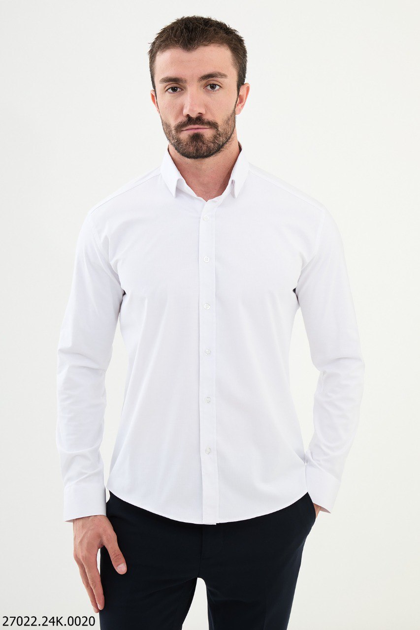 This white textured men's shirt combines timeless elegance with modern comfort. Crafted with a premium blend of 55% cotton and 45% polyester, it offers a breathable, wrinkle-resistant design that's perfect for Fall and Winter seasons. Its structured collar and subtle texture make it versatile for both professional and casual settings.
