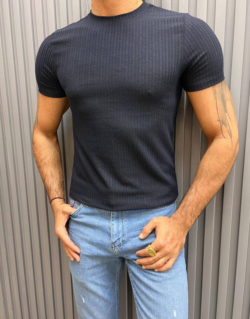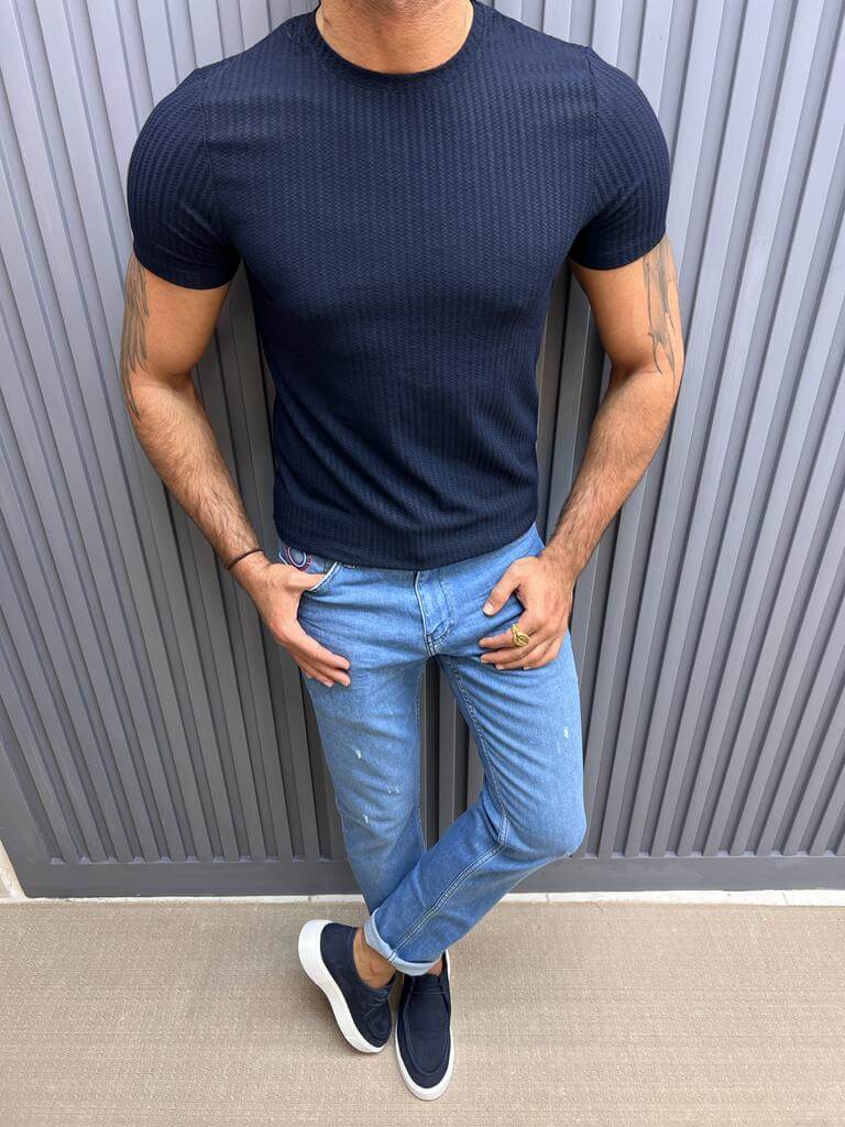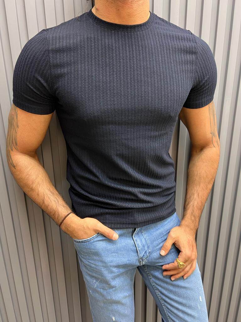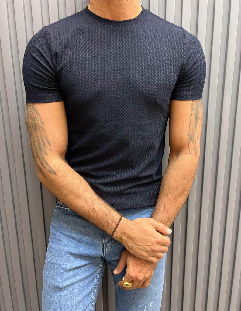 Med en fint texturerad mörkblå -t-shirt med rund hals