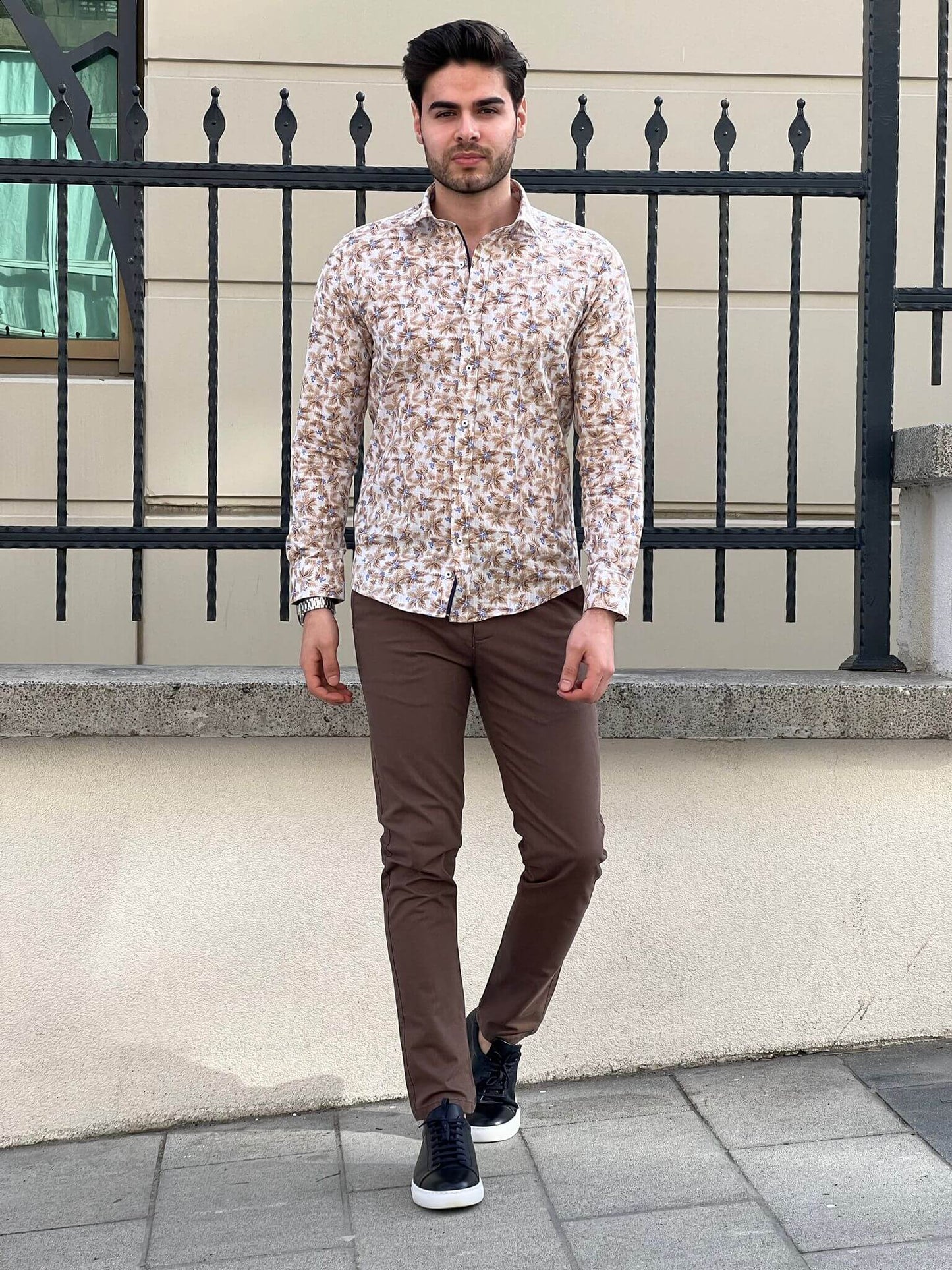 Med en högkvalitativ smal passform mönstrad beige bomullsskjorta.