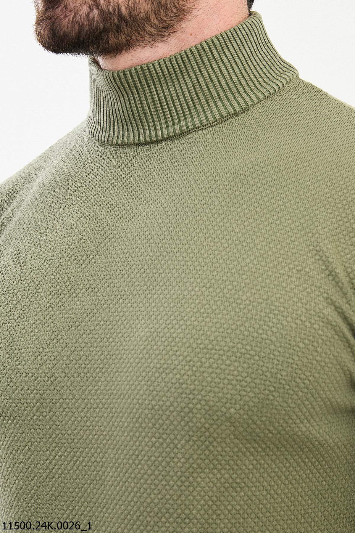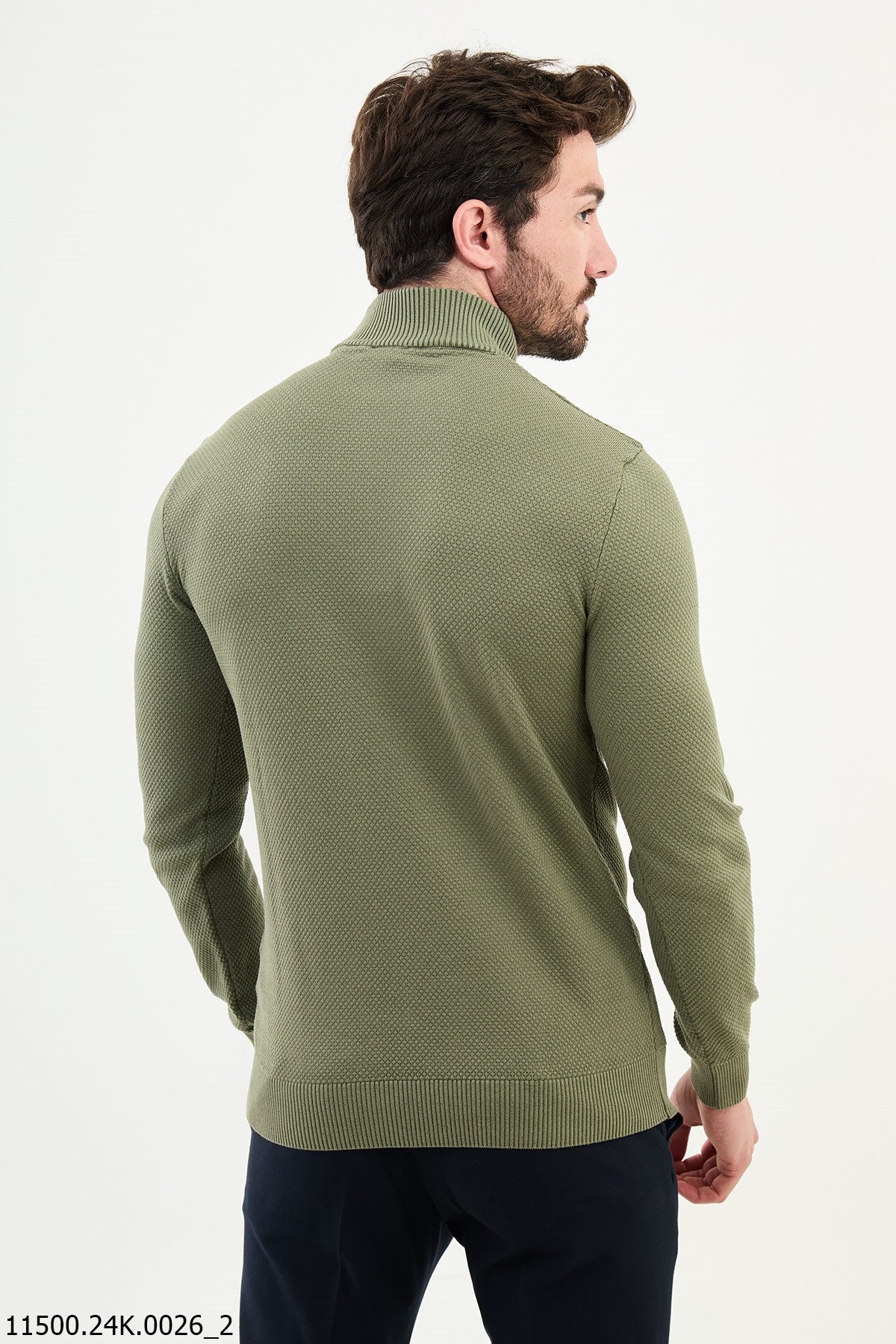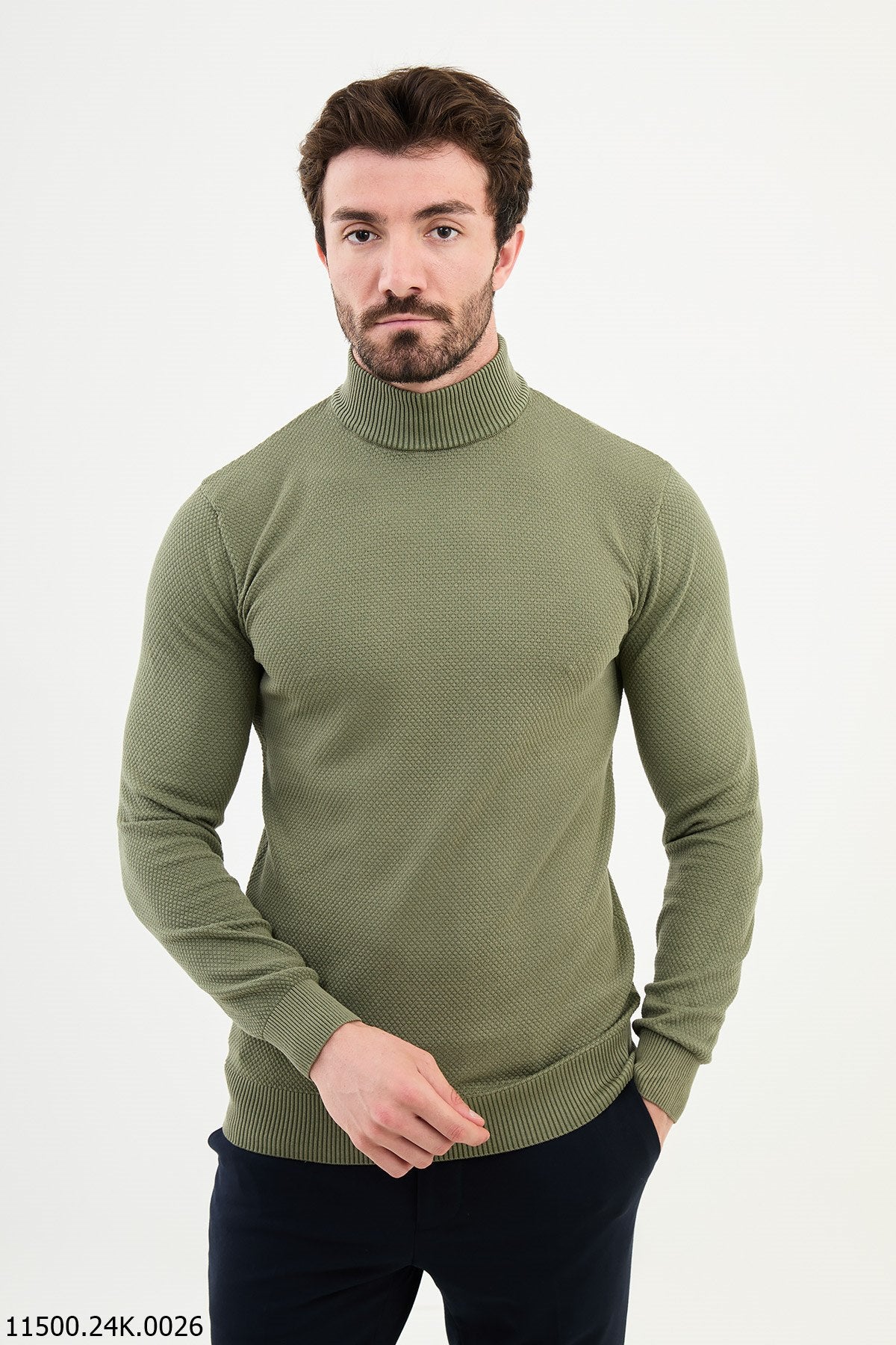 HolloMen Olive Green Textured Turtleneck Sweater.
